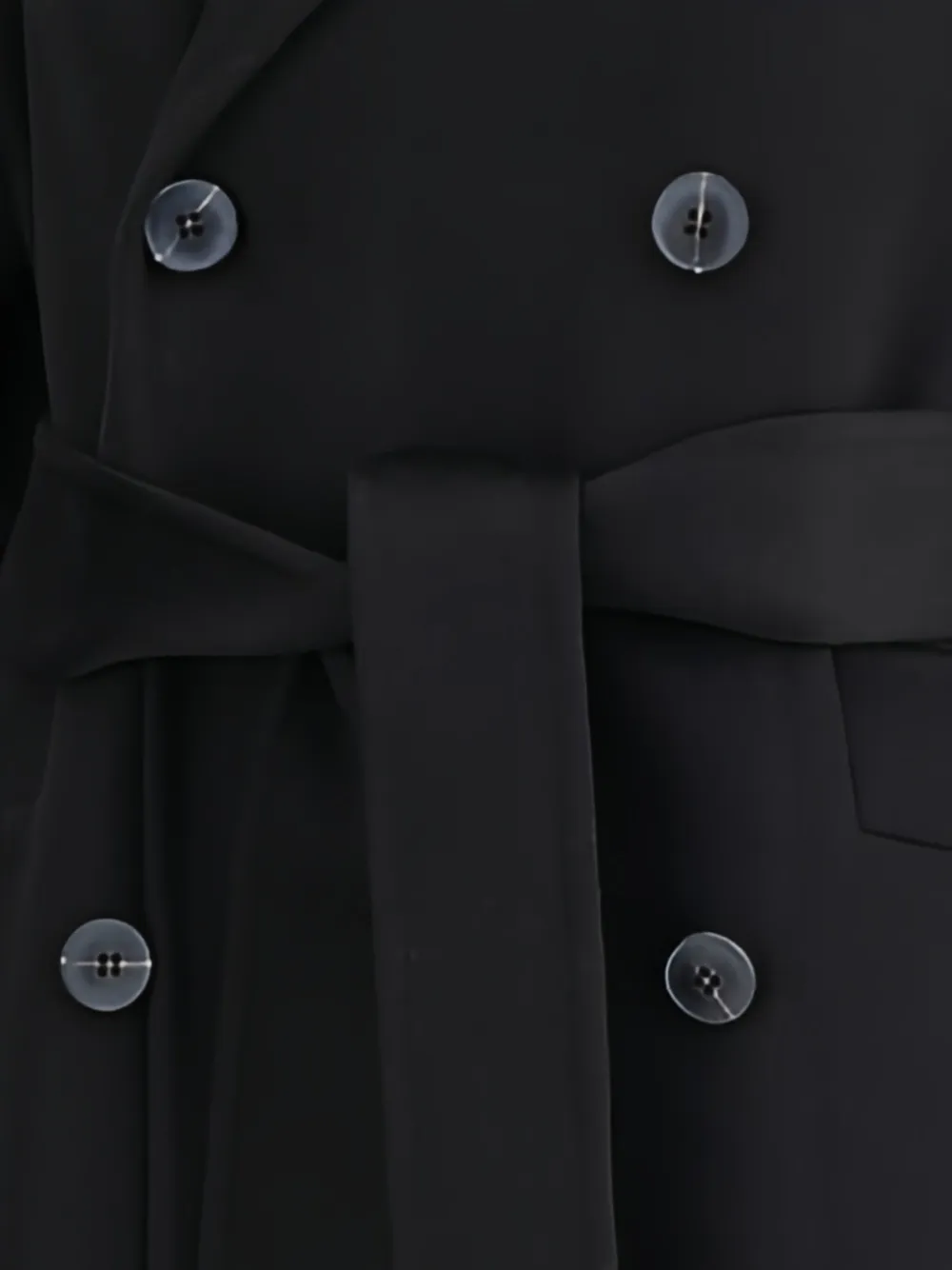 Черная двубортная застежка на поясе-самокате, длинные рукава.