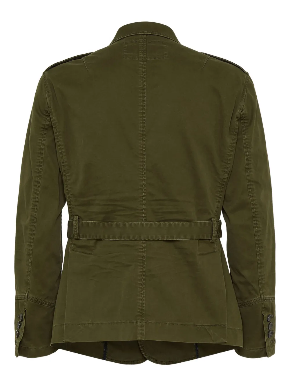 Оливково-зеленые карманы с клапанами, застежка на пуговицы, пояс на талии, эполеты с зазубринами на лацканах.