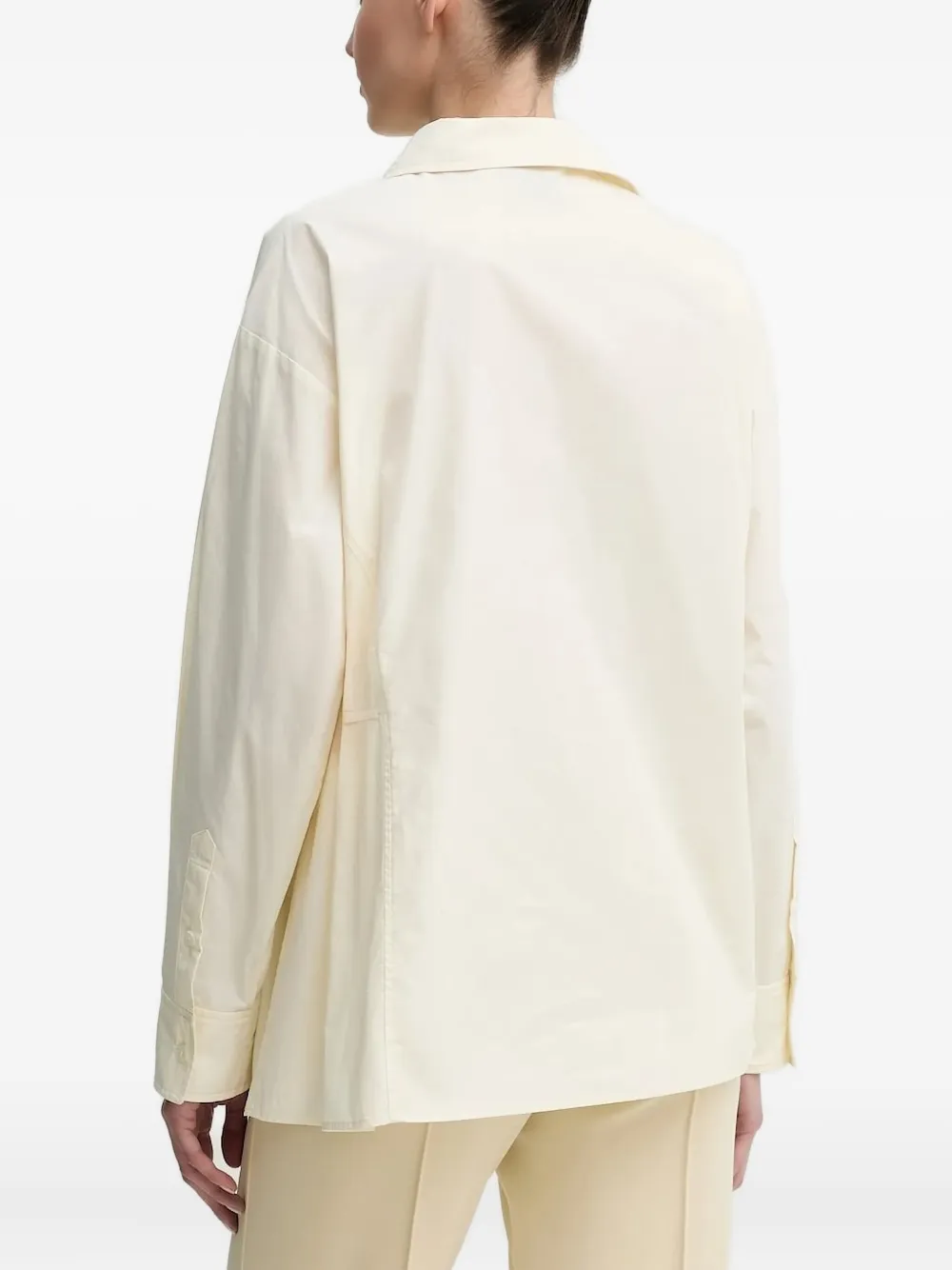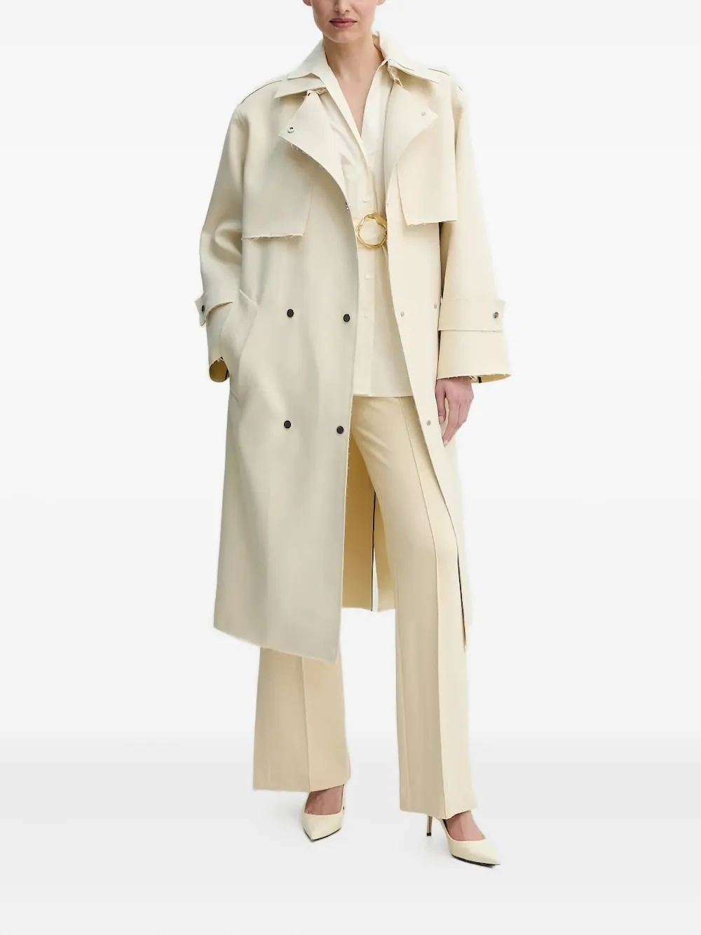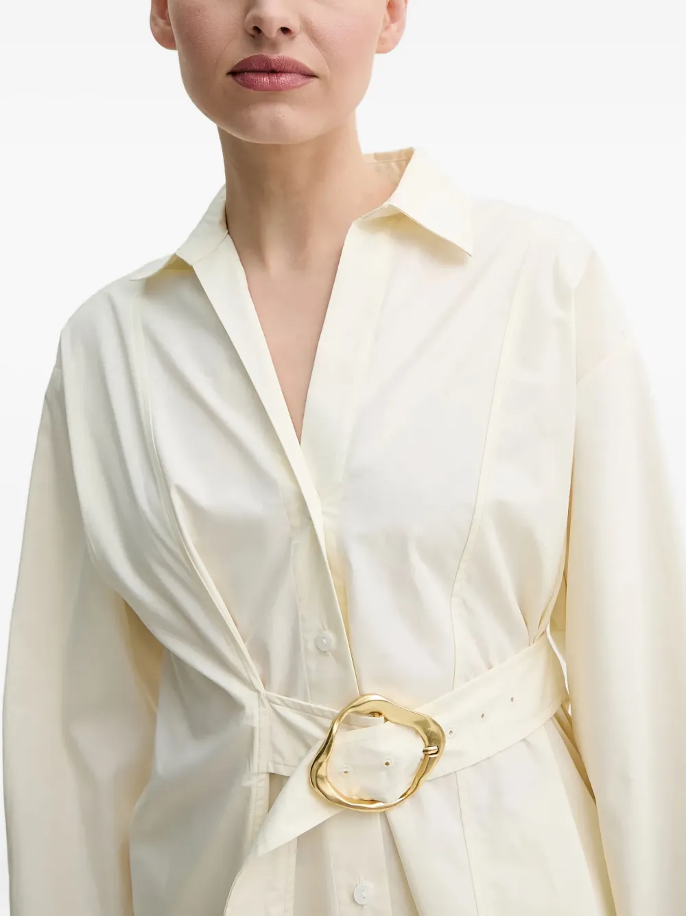 Отложной воротник белого цвета, длинные рукава, застежка на пуговицы, закругленный подол, пояс с пряжкой золотистого тона