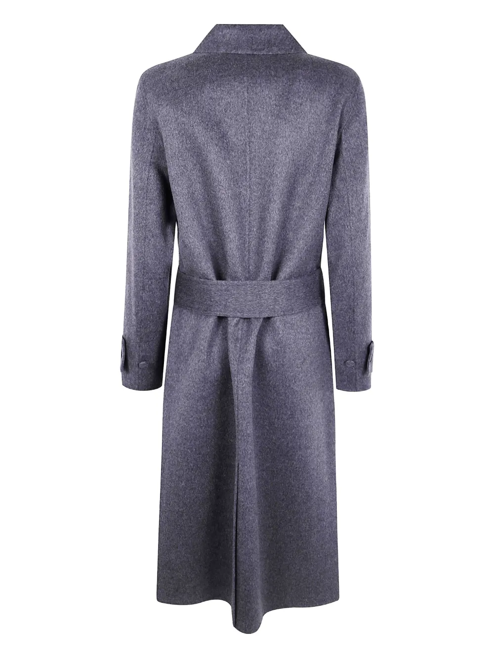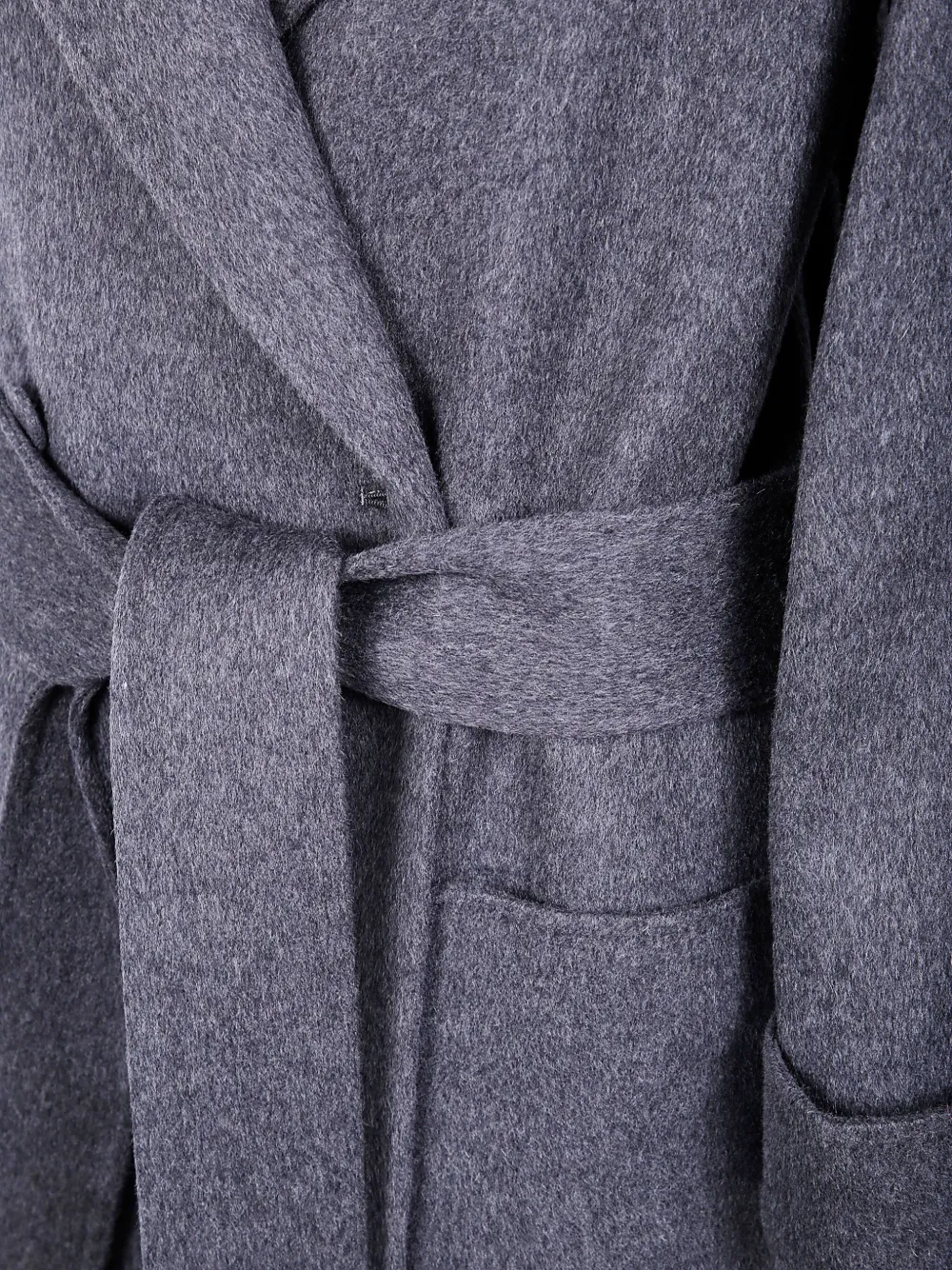 Шерстяной халат дымчато-серого цвета с завязывающимся поясом, длинными рукавами и накладными карманами по бокам.