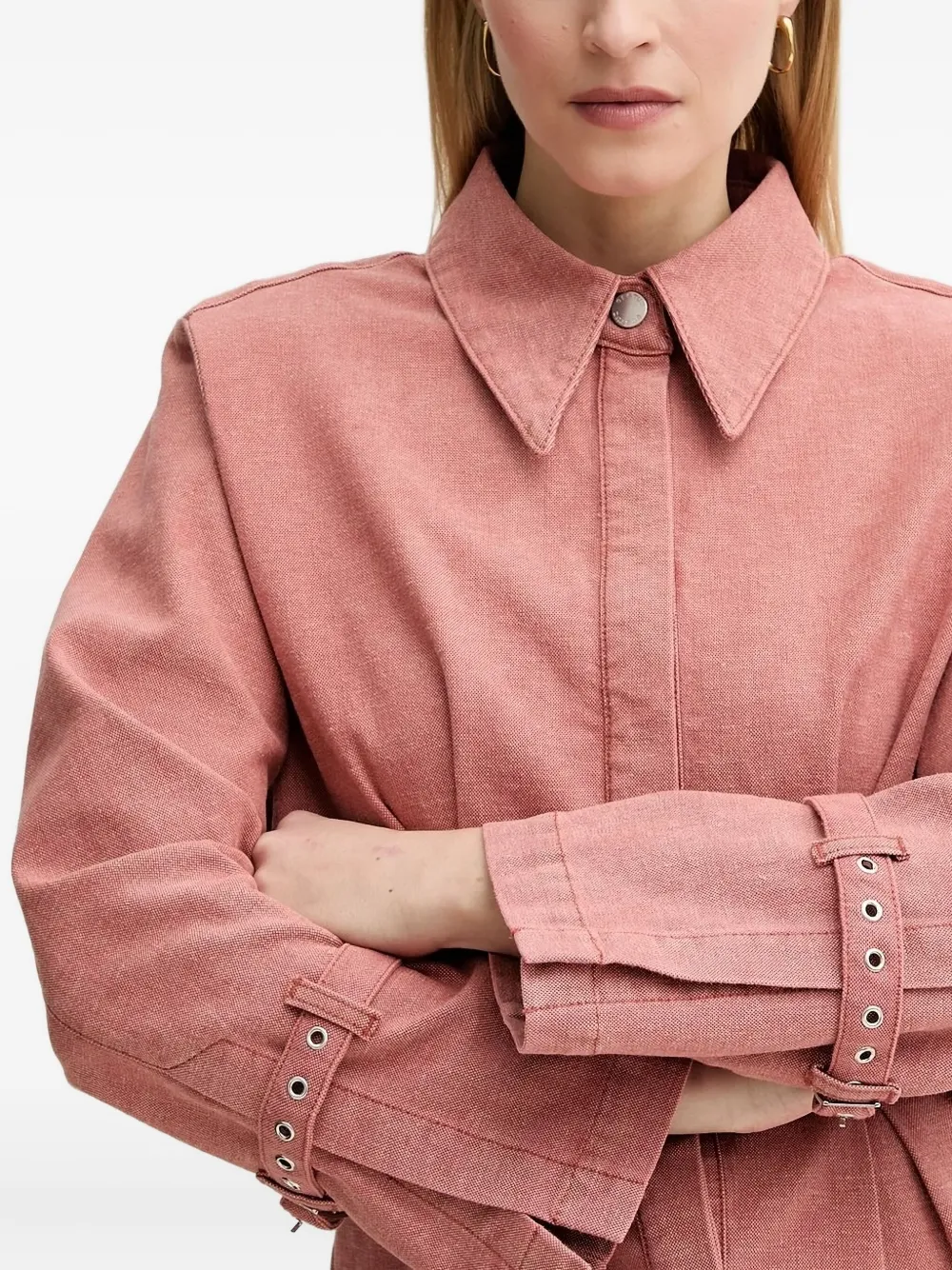 Вырез горловины цвета пыльной розы, застежка на пуговицы, длинные рукава, манжеты на пряжках.