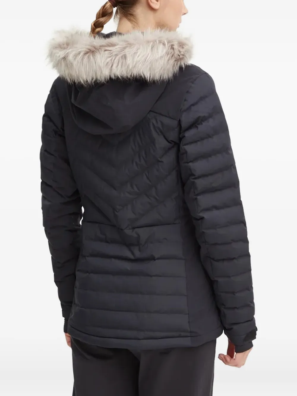 Черная стеганая модель, отделка из искусственного меха, застежка-молния, диагональная простежка, два кармана на молнии.