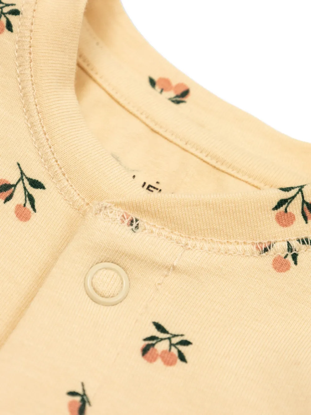 Бежевый, из органического хлопка, с персиковым узором по всей поверхности, с длинными рукавами, застежкой на кнопки.