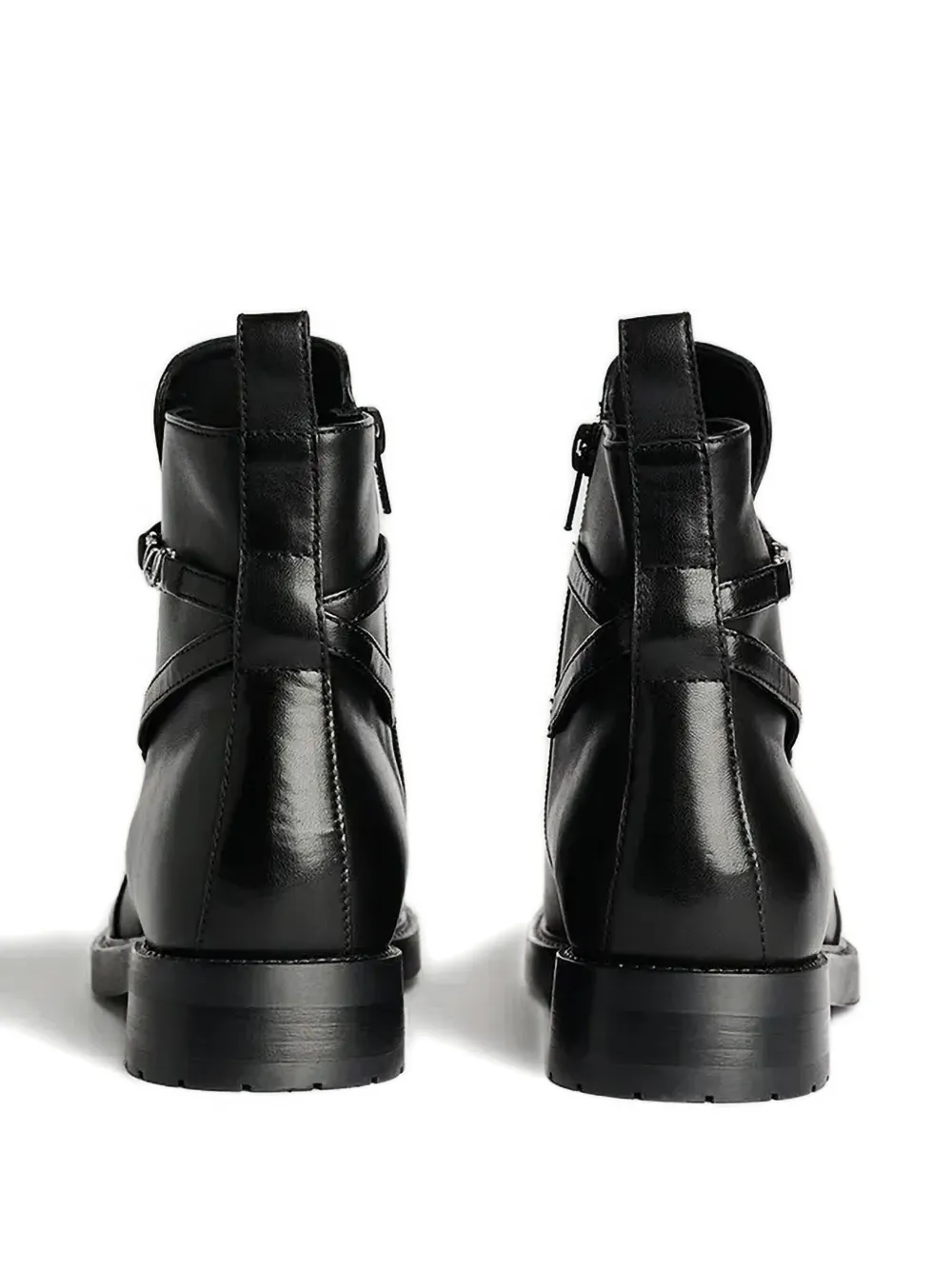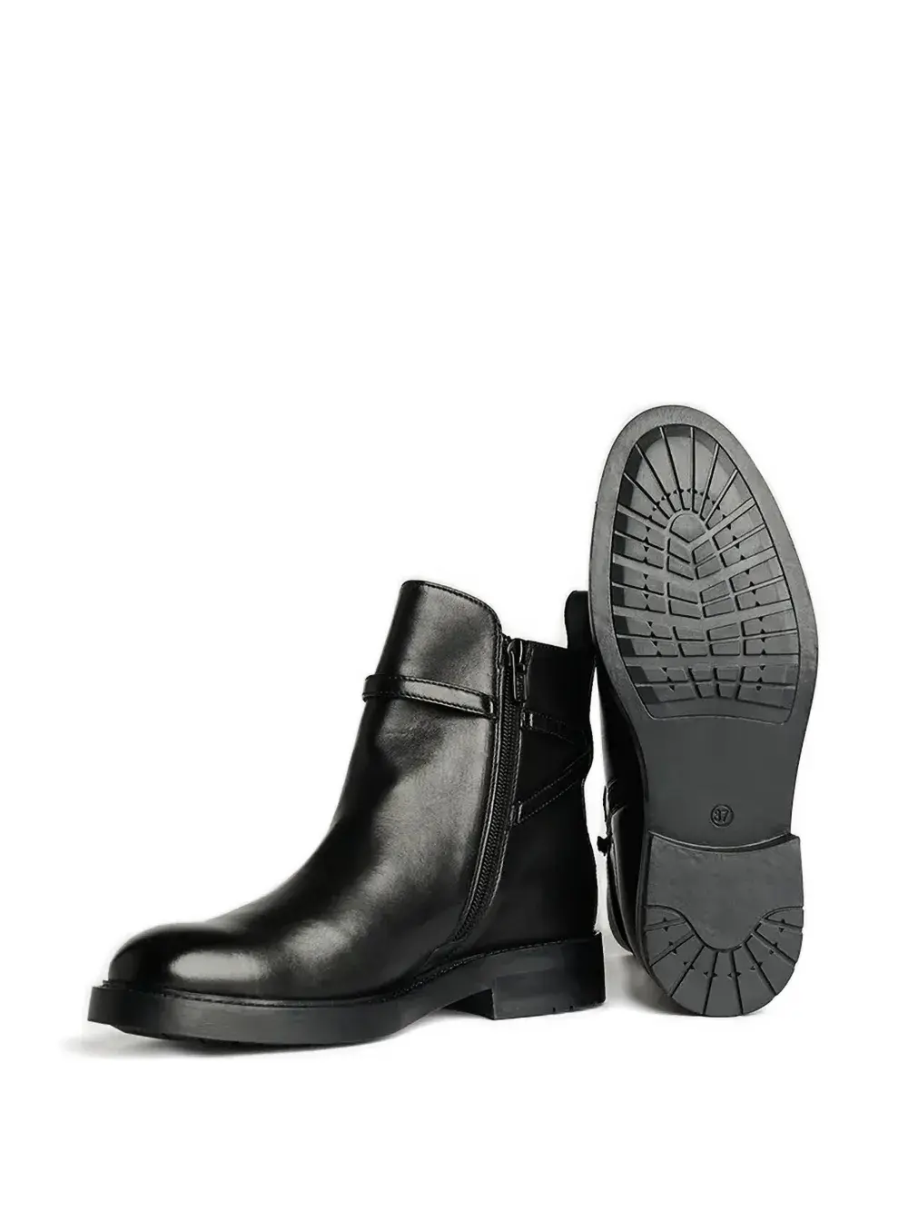 Верх из черной кожи, застежка-молния сбоку, пряжка, ремешок, плоский каблук, круглый носок.