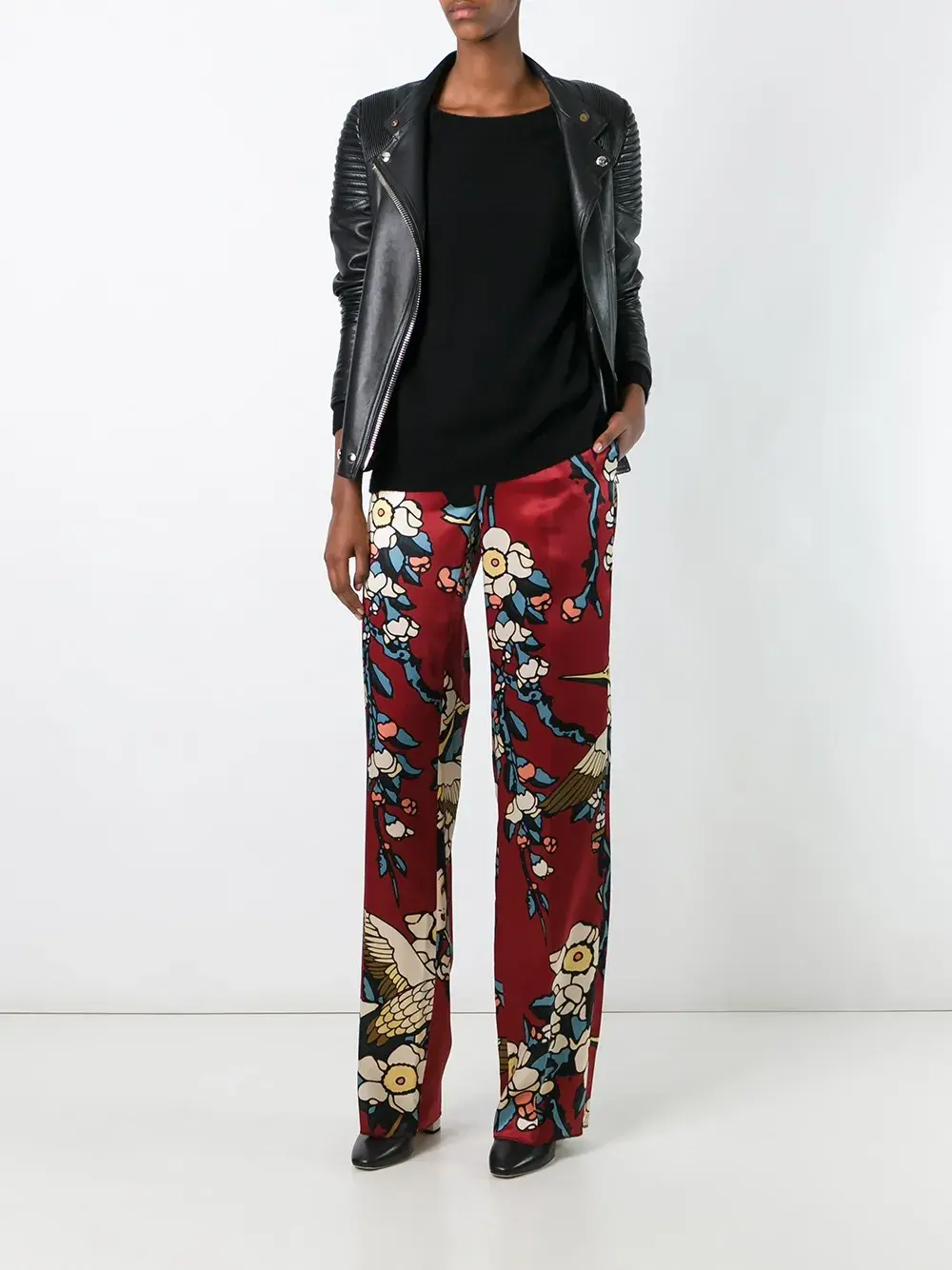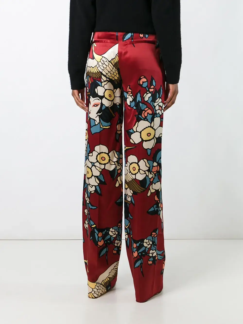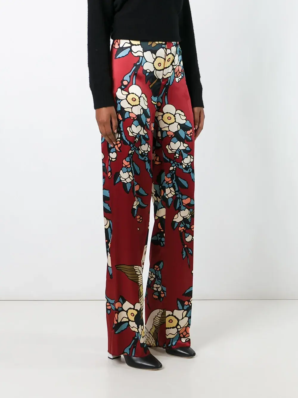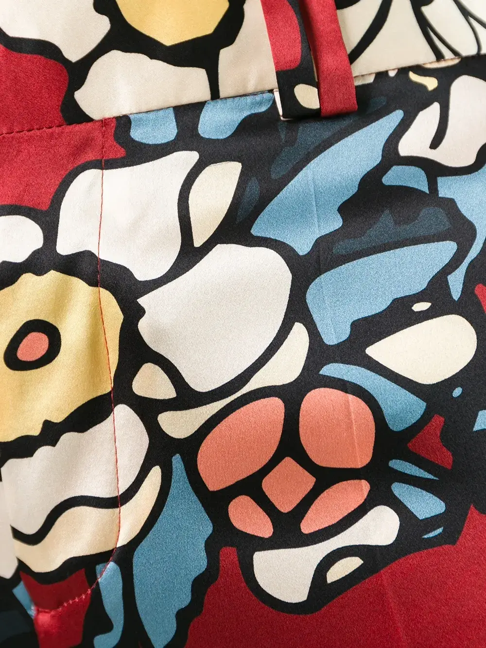 Красные шелковые брюки с принтом 'Blossom' от Dsquared2(Дискваред). Потайная застежка спереди, сплошной узор, строгий крой, задние карманы с листочкой, боковые карманы, широкие брючины, стандартная длина.
