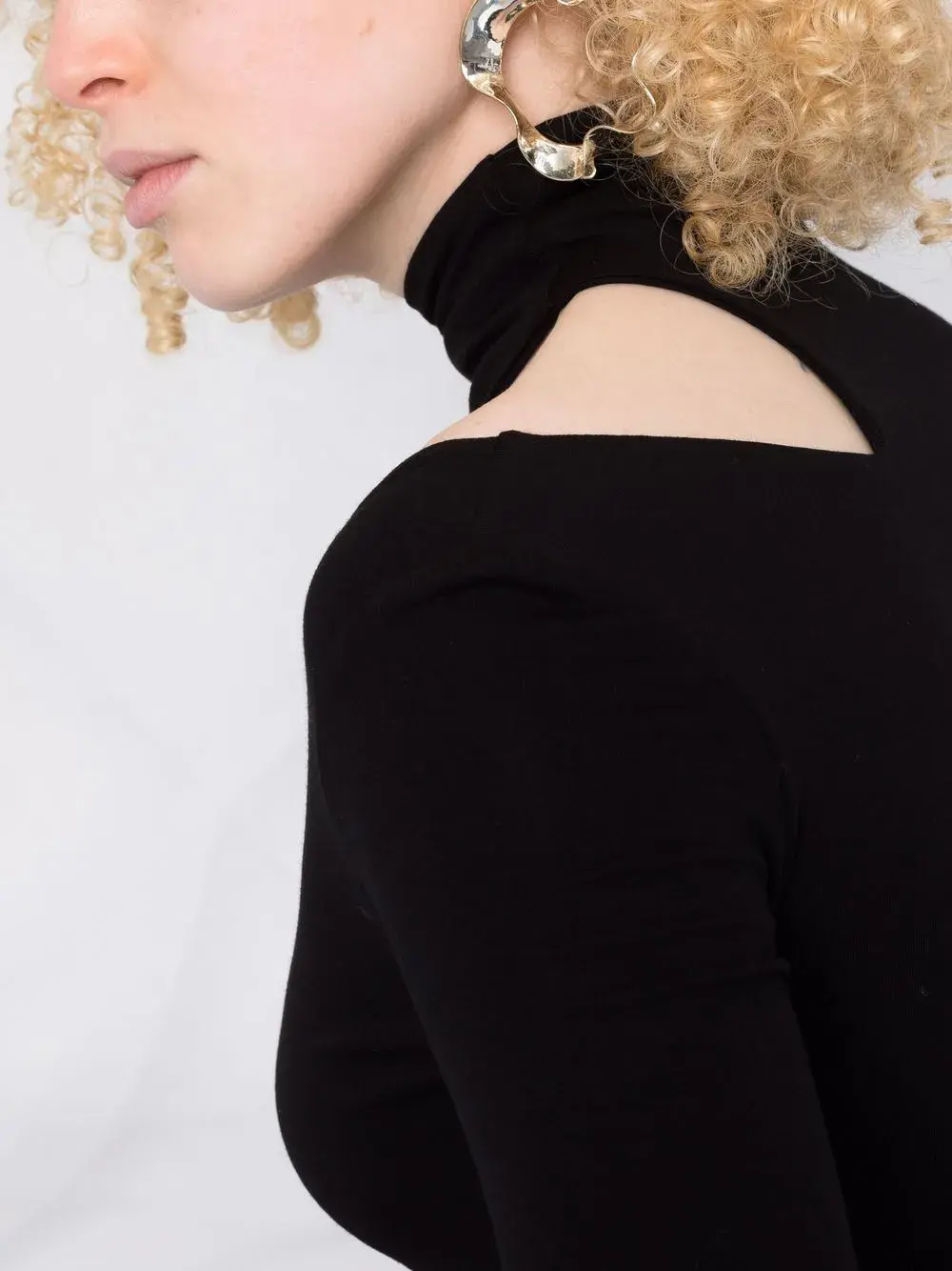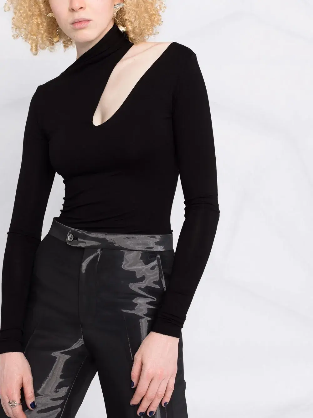 Вырезные детали, высокий воротник, длинные рукава, узкий крой и прямой подол. Цвет: черный.