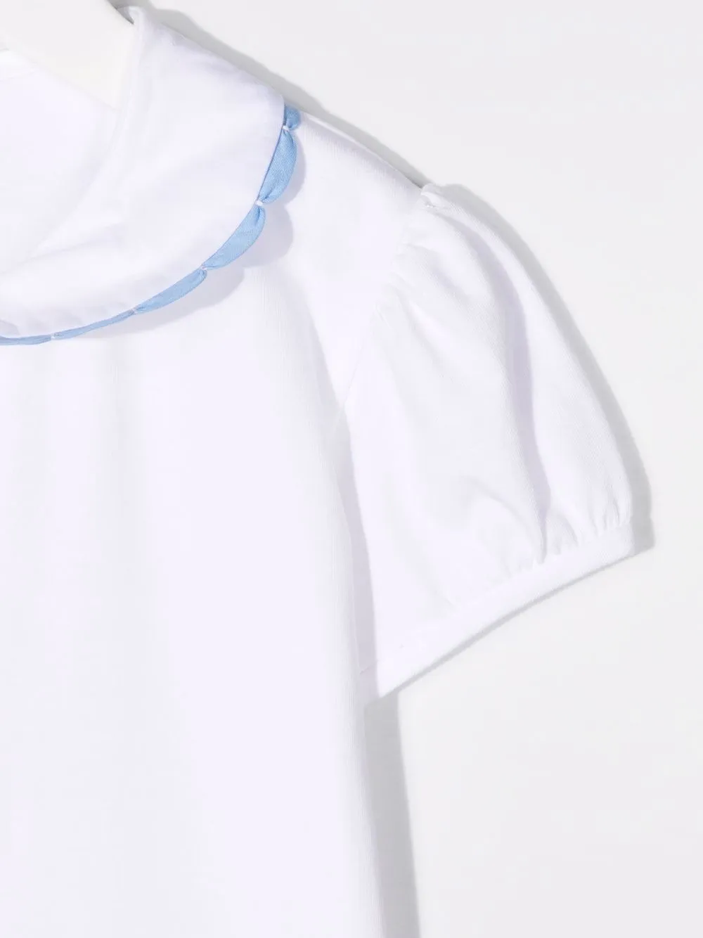 Контрастная отделка, воротник Питер Пэн, планка на пуговицах спереди и короткие рукава.