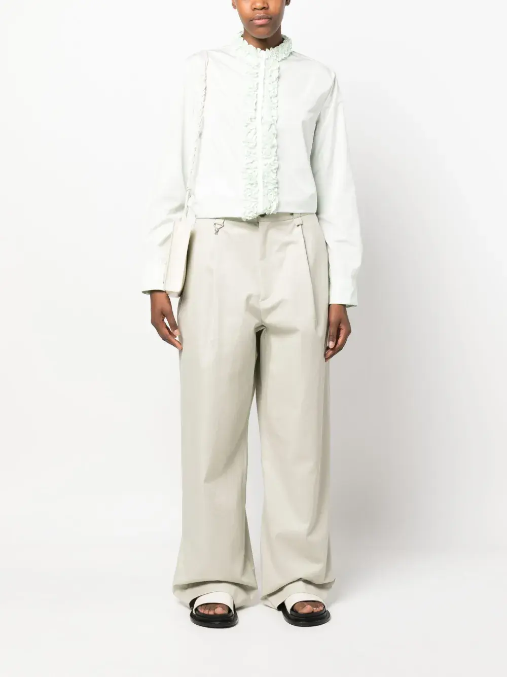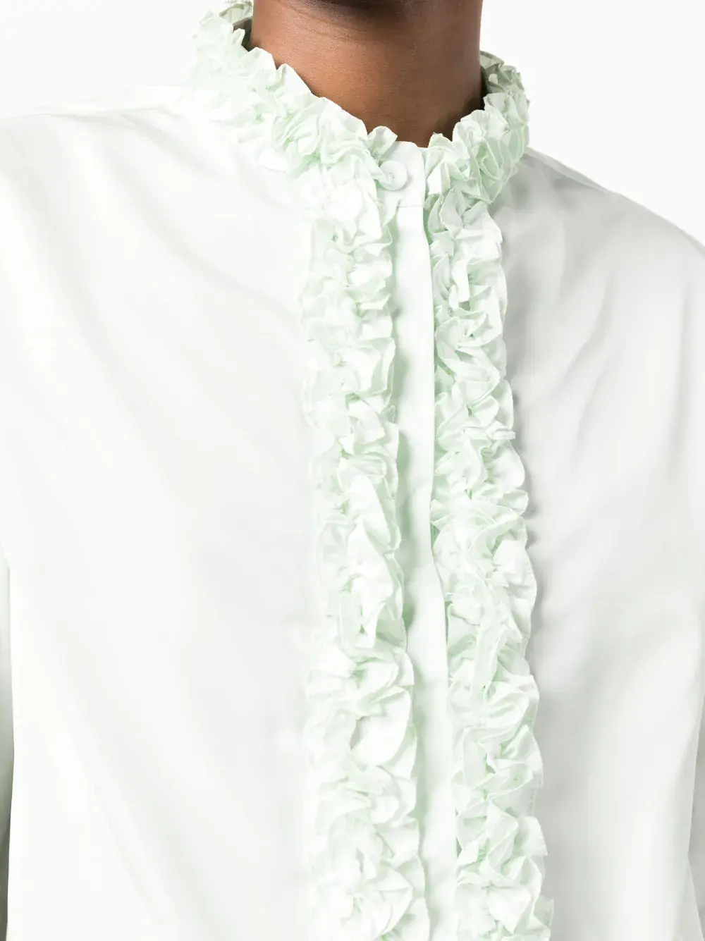 Светло-зеленый, вставки с оборками, воротник-стойка, застежка на пуговицах спереди, длинные рукава, манжеты на пуговицах и прямой подол.
