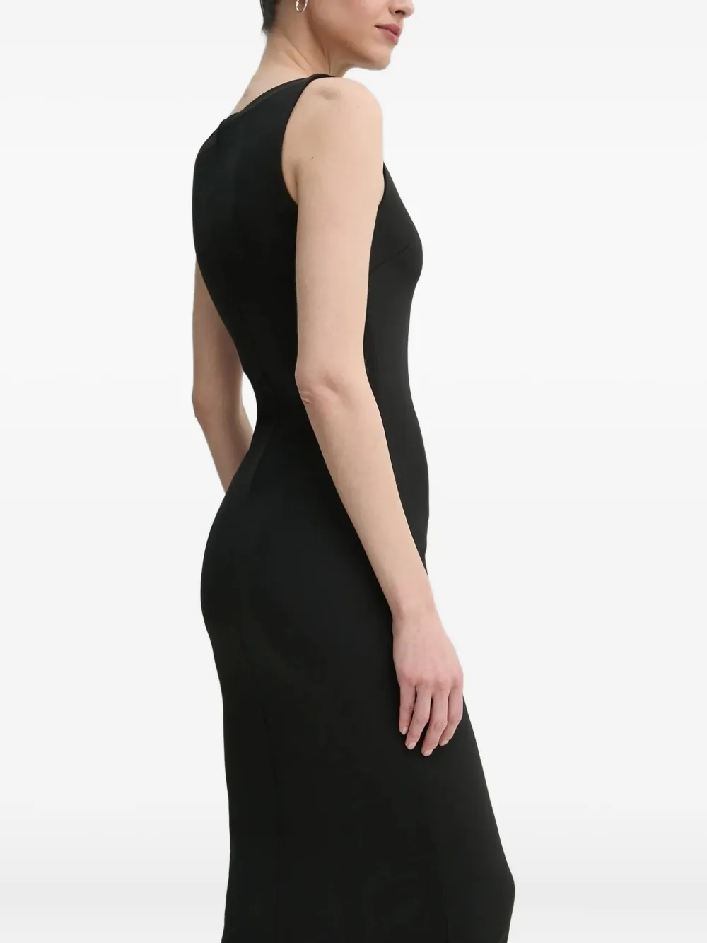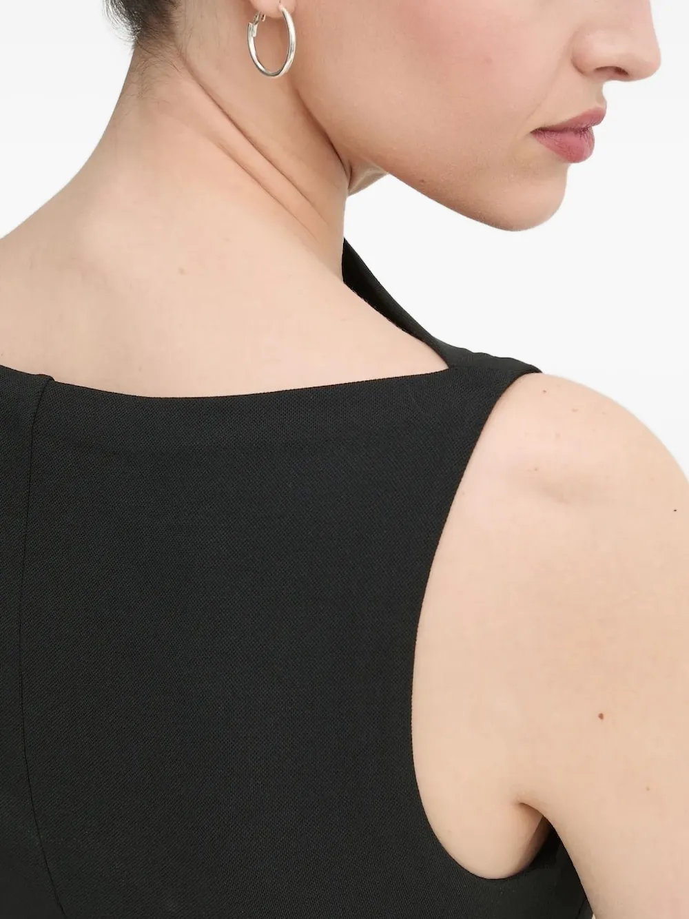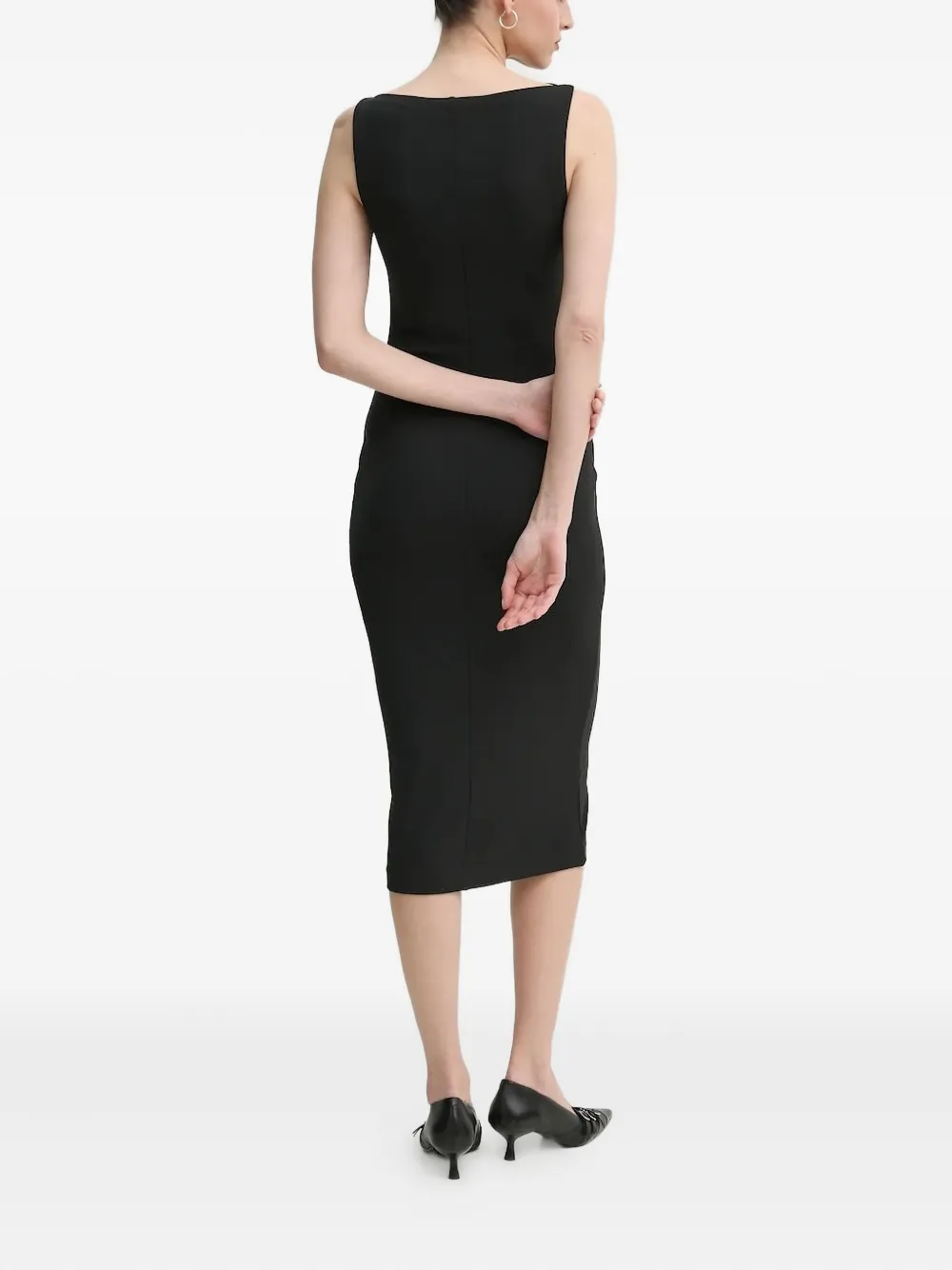Черное платье без рукавов с вырезом-лодочкой и прямым подолом, длина миди