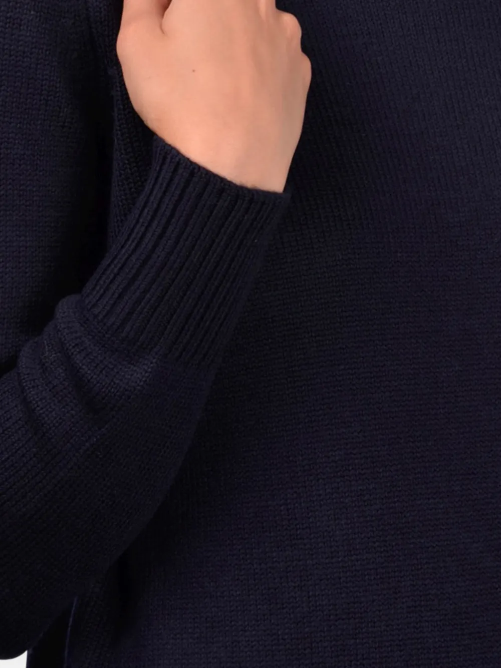 Шерсть темно-синего цвета, вырез «лодочка», длинные рукава, ребристые манжеты, ребристый подол.