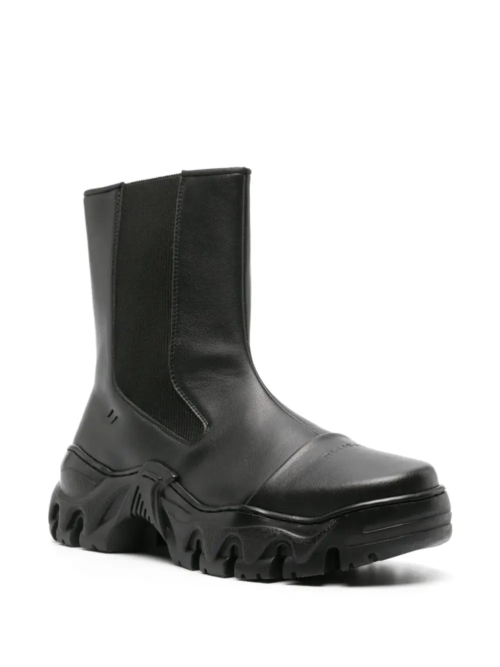 Черный, искусственная кожа, закругленный носок, эластичные боковые вставки, высота по щиколотку и массивная резиновая подошва. . Узнать больше о том, какие товары получают отметку «Ответственный выбор», можно из материала «Как мы оцениваем экологичность и этичность».
