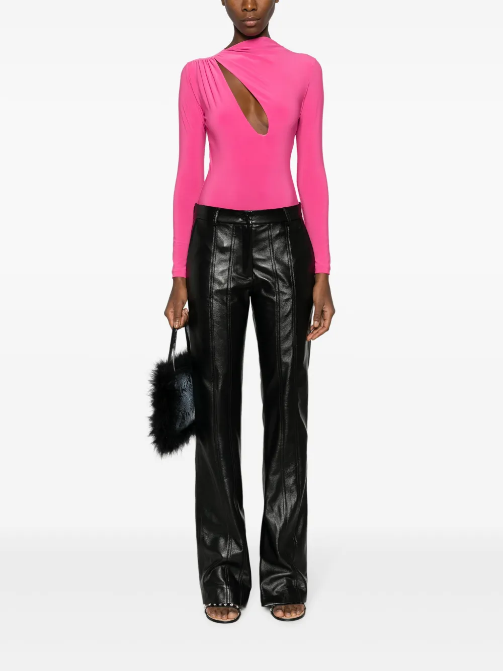 Бледно-розовый, эластичный материал, вырезные детали, воротник со сборками, высокий воротник и длинные рукава.