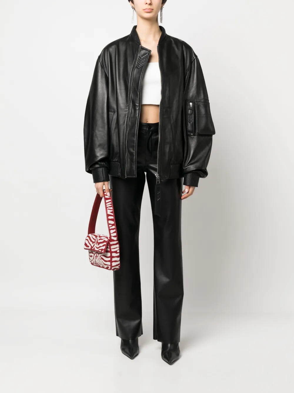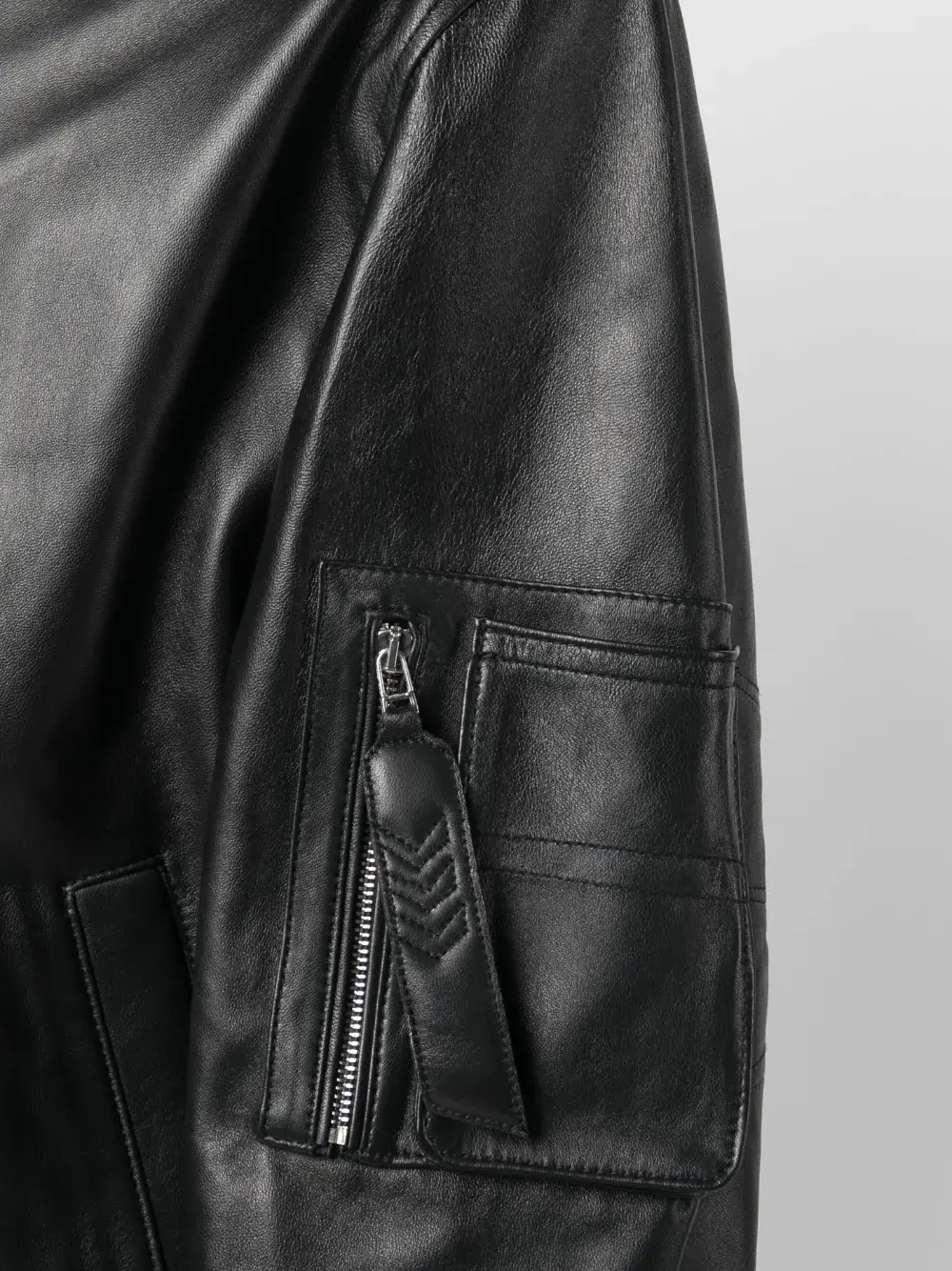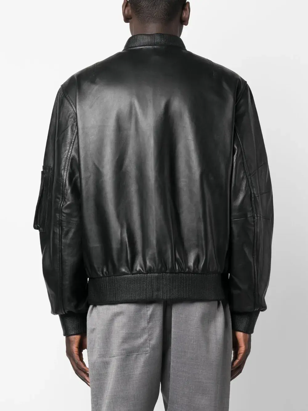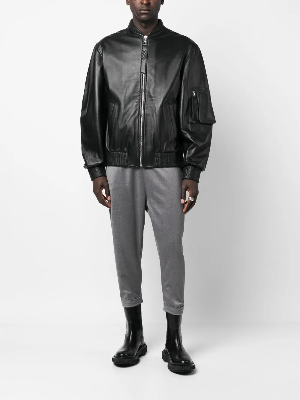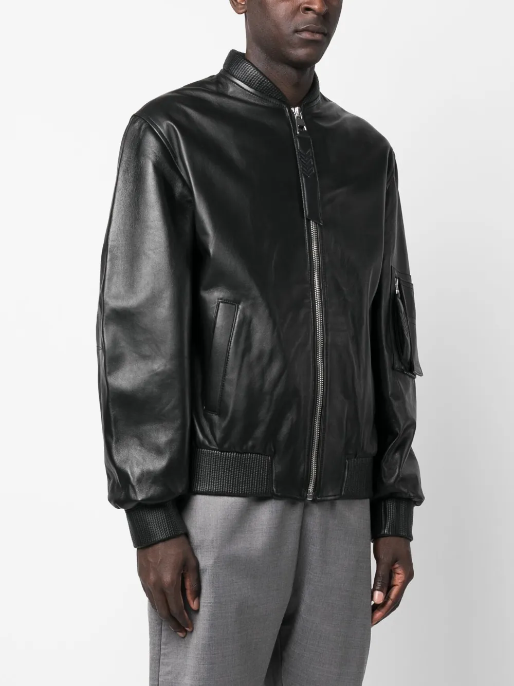Черный, кожа, отделка в рубчик, воротник-стойка, застежка на молнии спереди, длинные рукава, прорезные карманы по бокам, карман с молнией на рукаве и прямой подол.