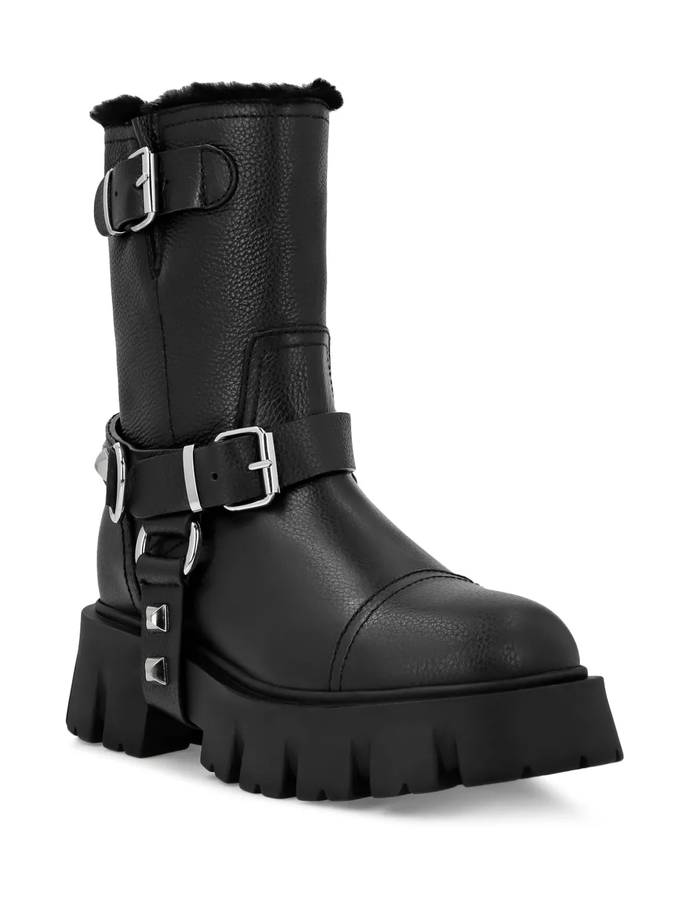 Черный, кожа, серебристый логотип, логотип на подошве, серебристые заклепки, серебристая фурнитура, застежка с двумя пряжками, закругленный носок, высота по щиколотку, подкладка из искусственного меха и массивная резиновая подошва c протектором.