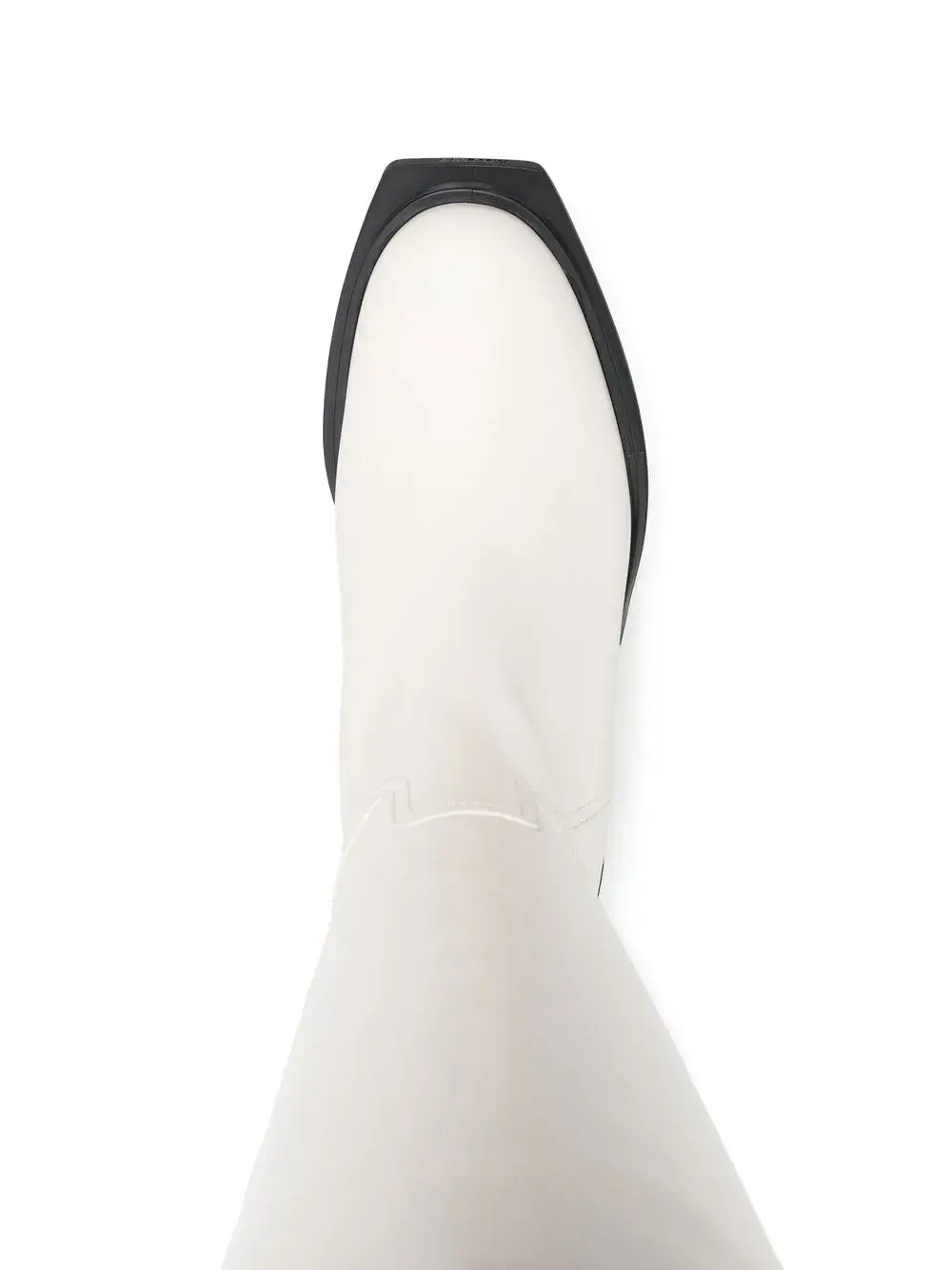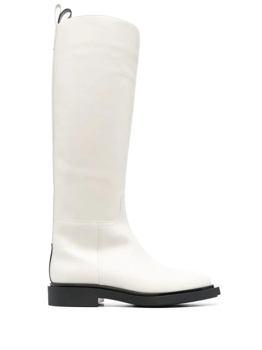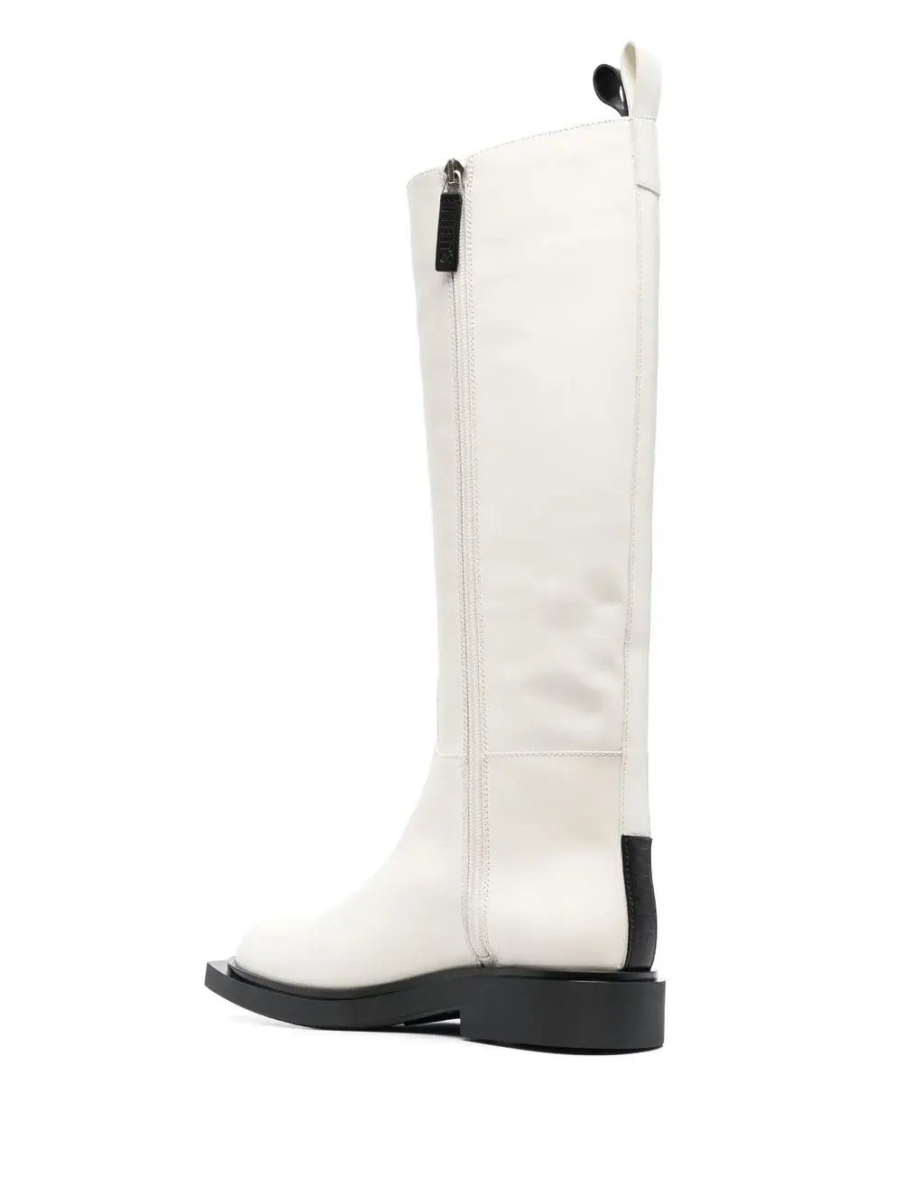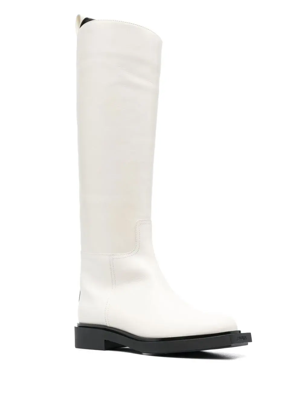 Белый, телячья кожа, закругленный носок, застежка на молнии сбоку, длина по колено, резиновая подошва и низкий каблук.