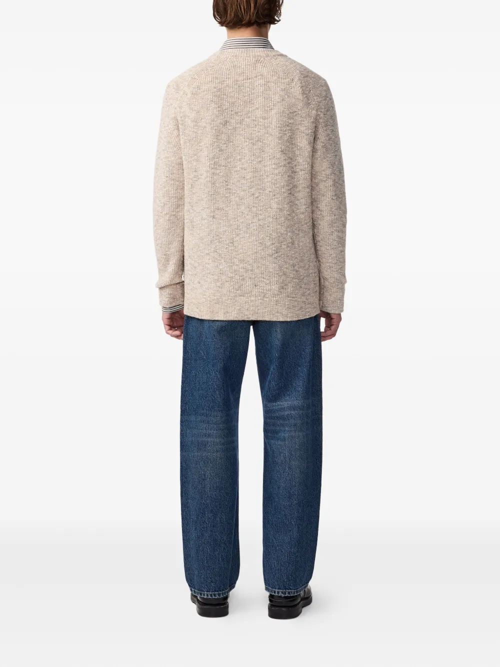Бежевый букле с текстурой рукава реглан, ребристые манжеты, ребристый подол, круглый вырез горловины.