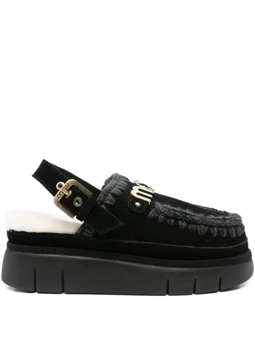 Верх из черной телячьей замши, трикотажная отделка, бляшка с логотипом, ремешок на пятке, застежка на пряжке, подошва на платформе