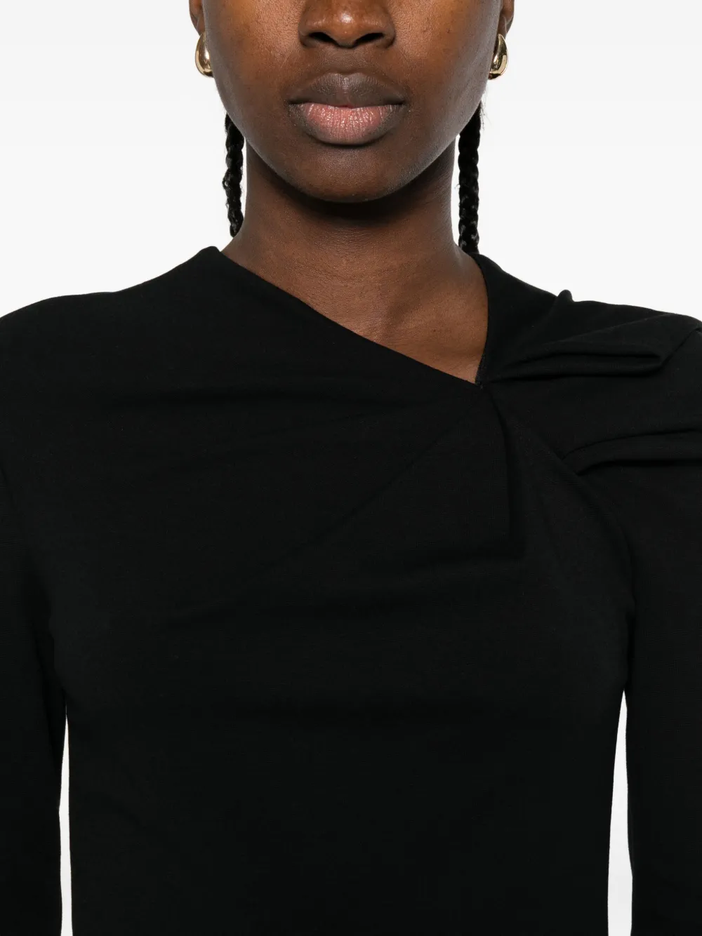 Черные рукава три четверти, асимметричный вырез и декоративный бант.