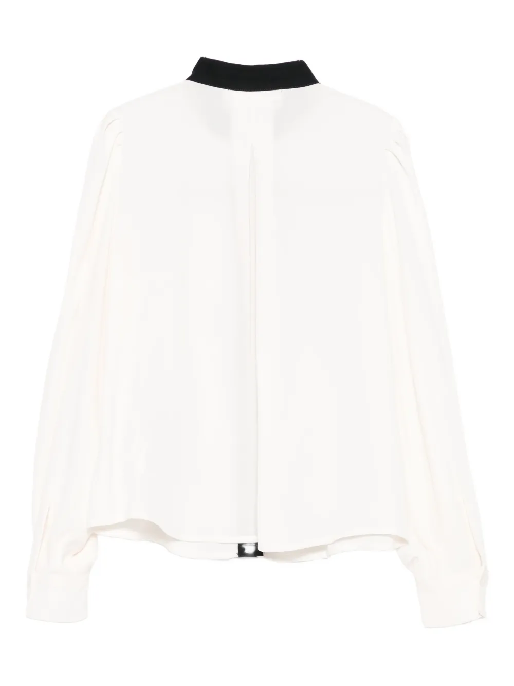 Бело-черная отделка, бант, длинные рукава, застежка на пуговицы.