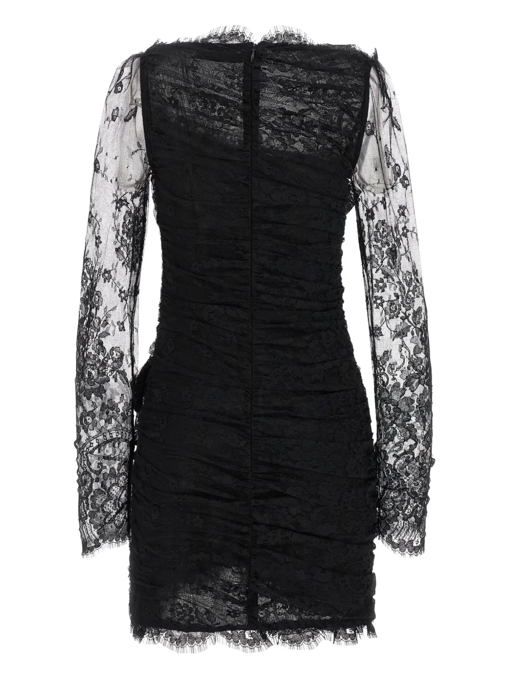 Черное цветочное кружево, длинные рукава, украшение в виде банта сзади, застежка-молния.