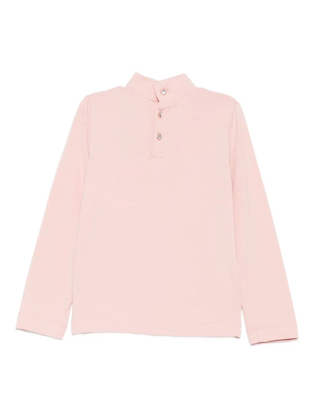Розовый бант на вороте, длинные рукава, высокий ворот, застежка на пуговицы сзади, вышитый логотип.
