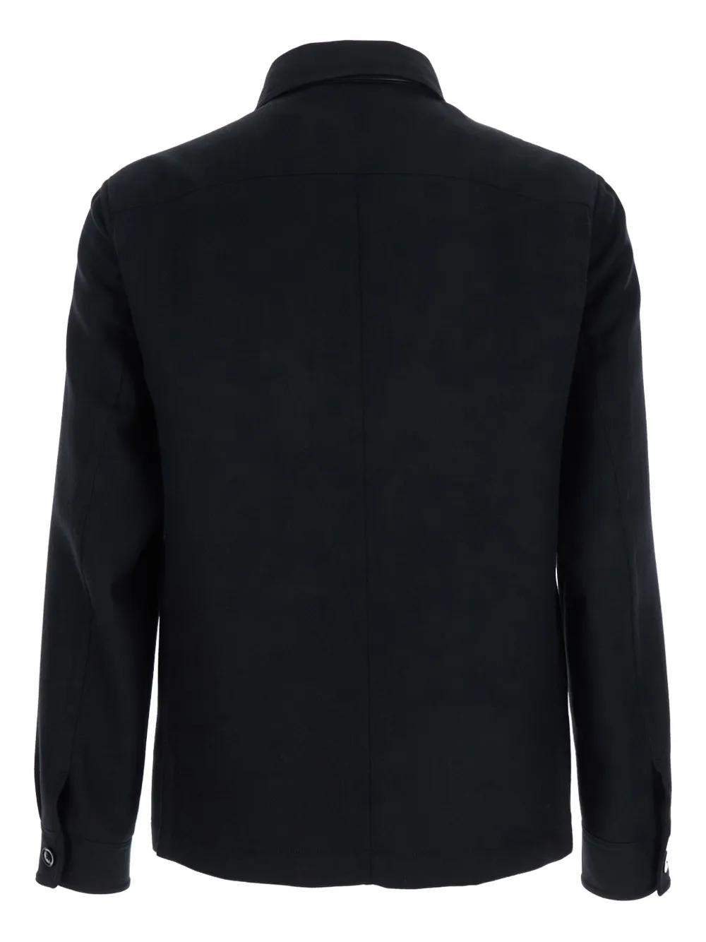 Черная шерсть, застежка на пуговицы, карманы с клапанами, длинные рукава, воротник рубашки.