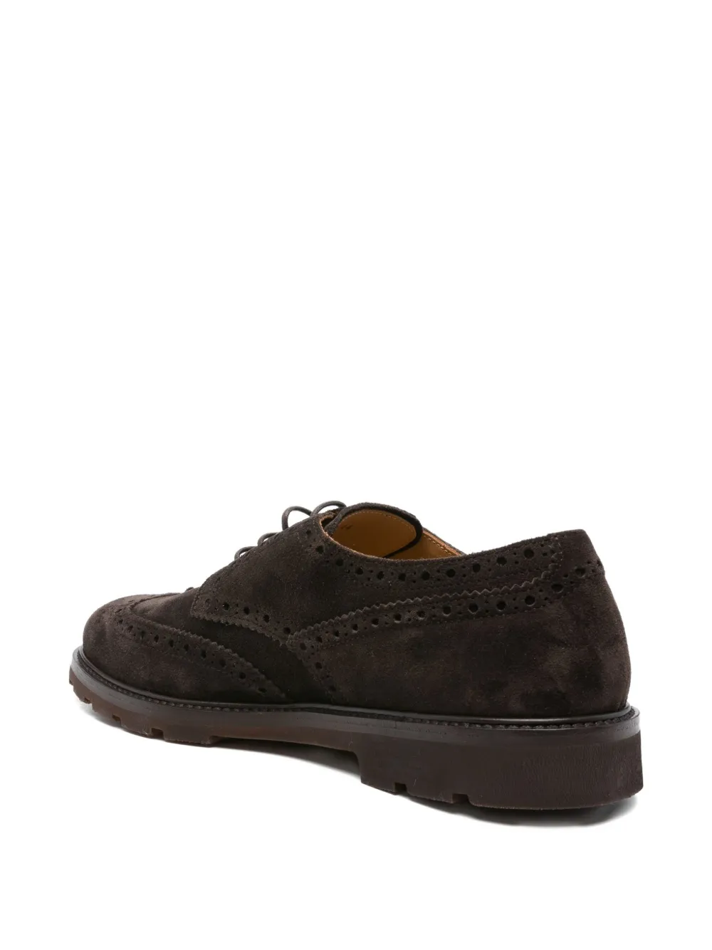 Коричневые замшевые кожаные туфли со шнуровкой, перфорацией и резиновой подошвой.