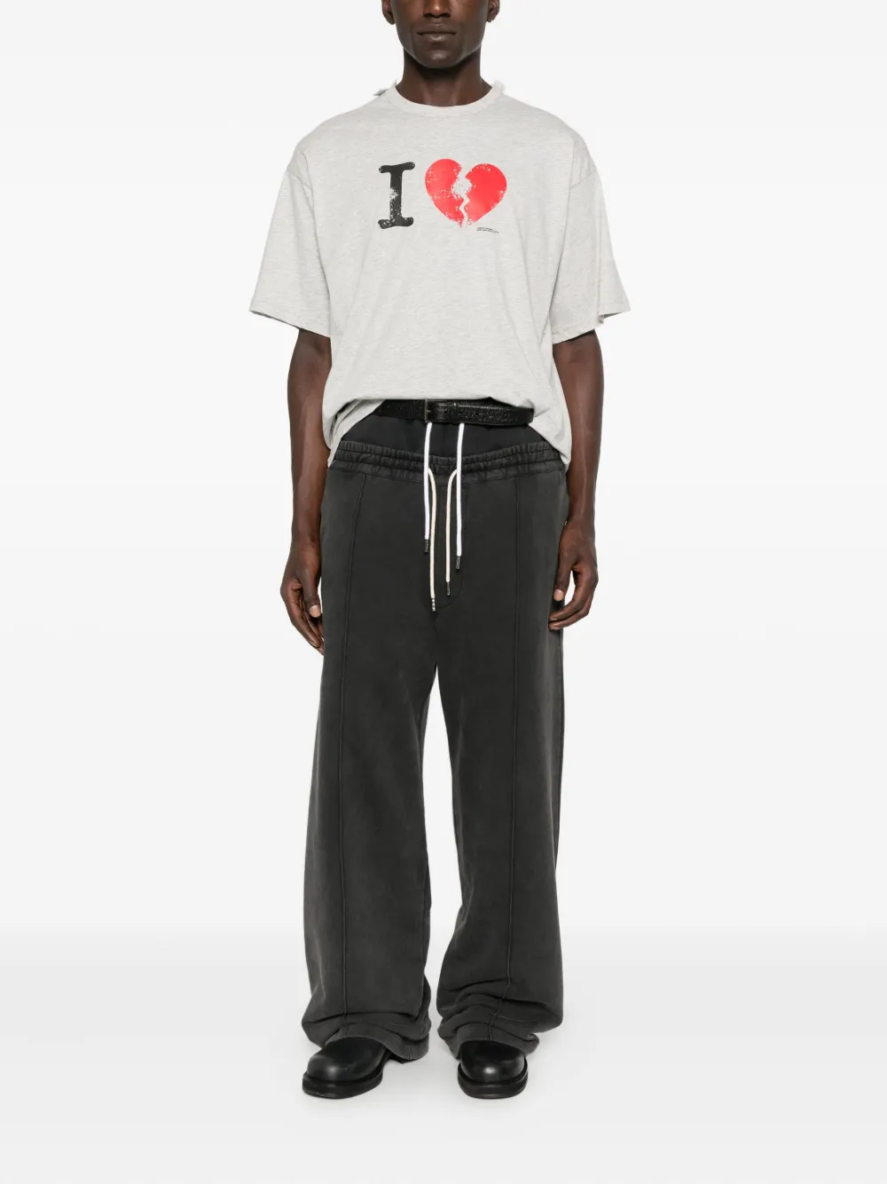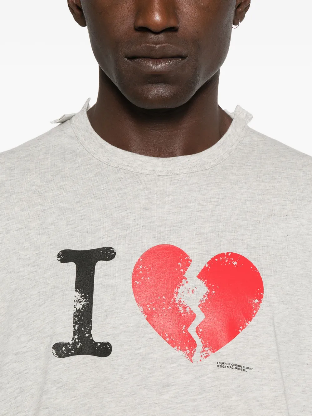 Светло-серый с короткими рукавами и круглым вырезом, с графическим принтом в виде разбитого сердца.