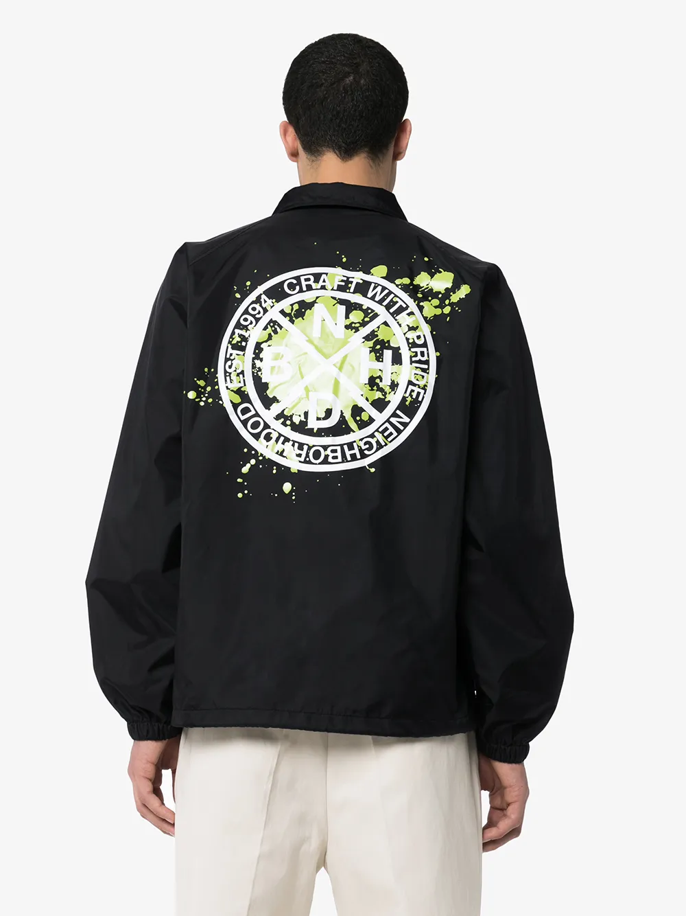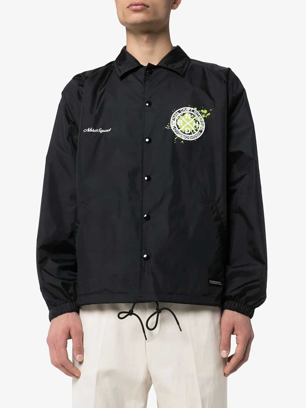 Куртка Brooks с логотипом от NEIGHBORHOOD. Косой воротник, застежка на кнопках, принт с логотипом спереди, вышитый логотип спереди, длинные рукава, эластичные манжеты, прорезные карманы по бокам, свободный силуэт и подол на шнурке. Цвет: черный.