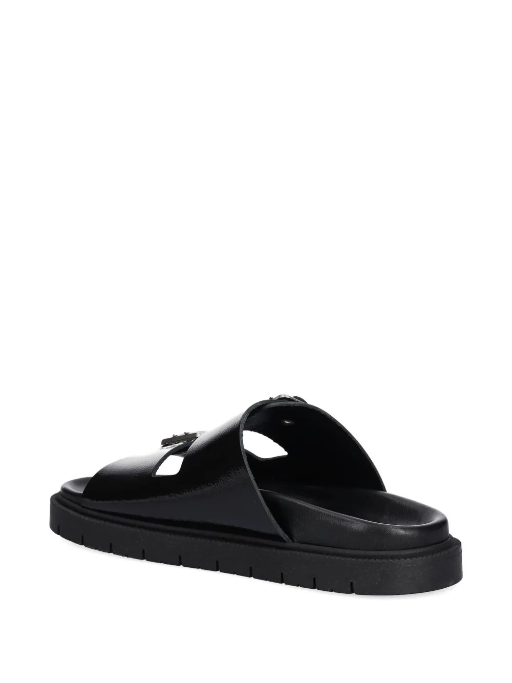 Черные двойные пряжки, серебристая фурнитура, плоская подошва, ребристая подошва.