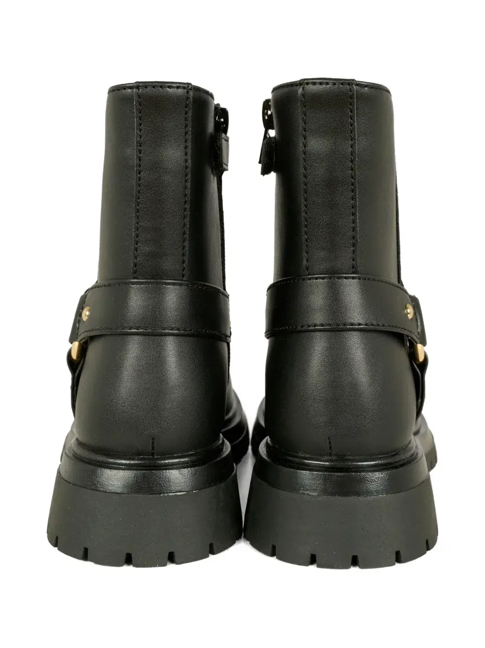 Черная пряжка, застежка-молния, круглый носок, квадратный каблук.