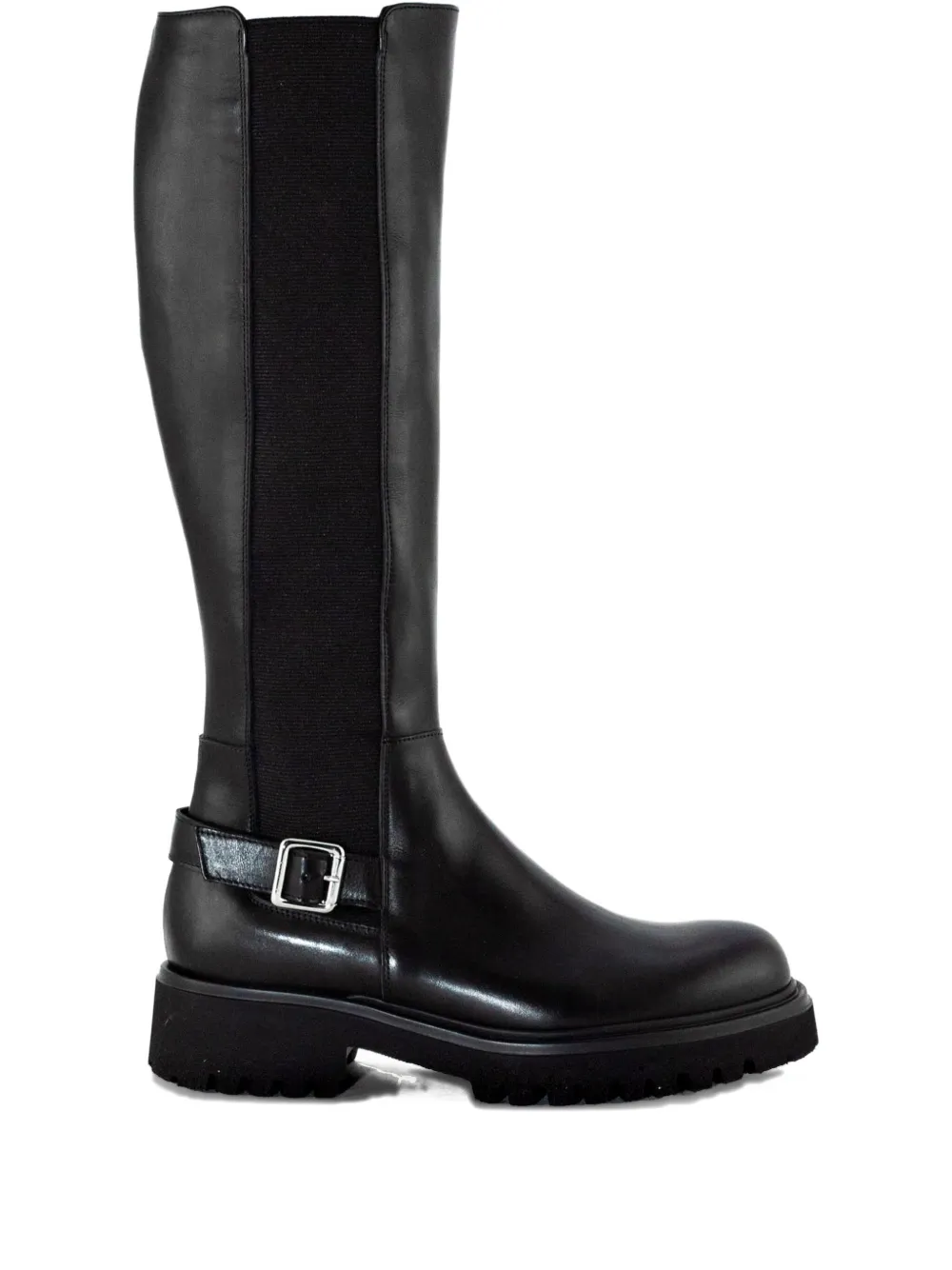Верх из черной кожи, серебристые пряжки, эластичные вставки по бокам, круглый носок.