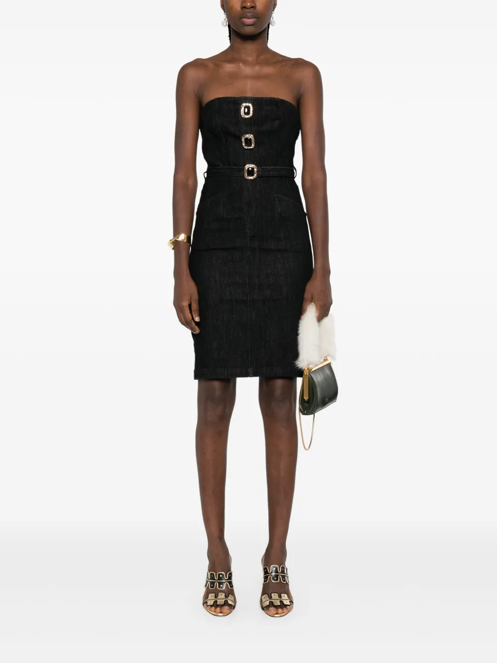 Черный деним без бретелек с пряжкой и поясом на талии.