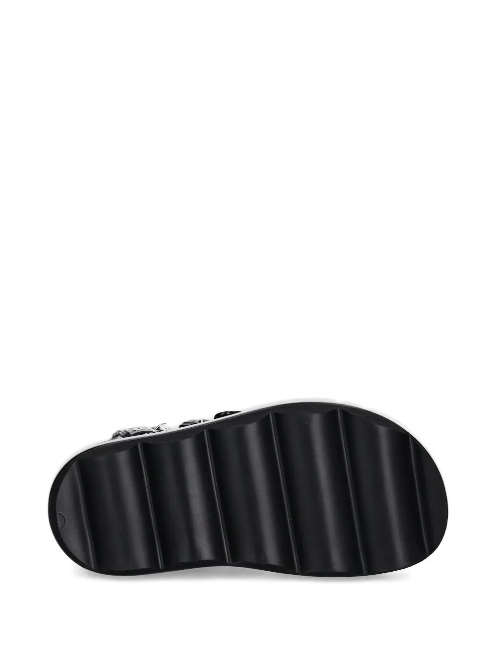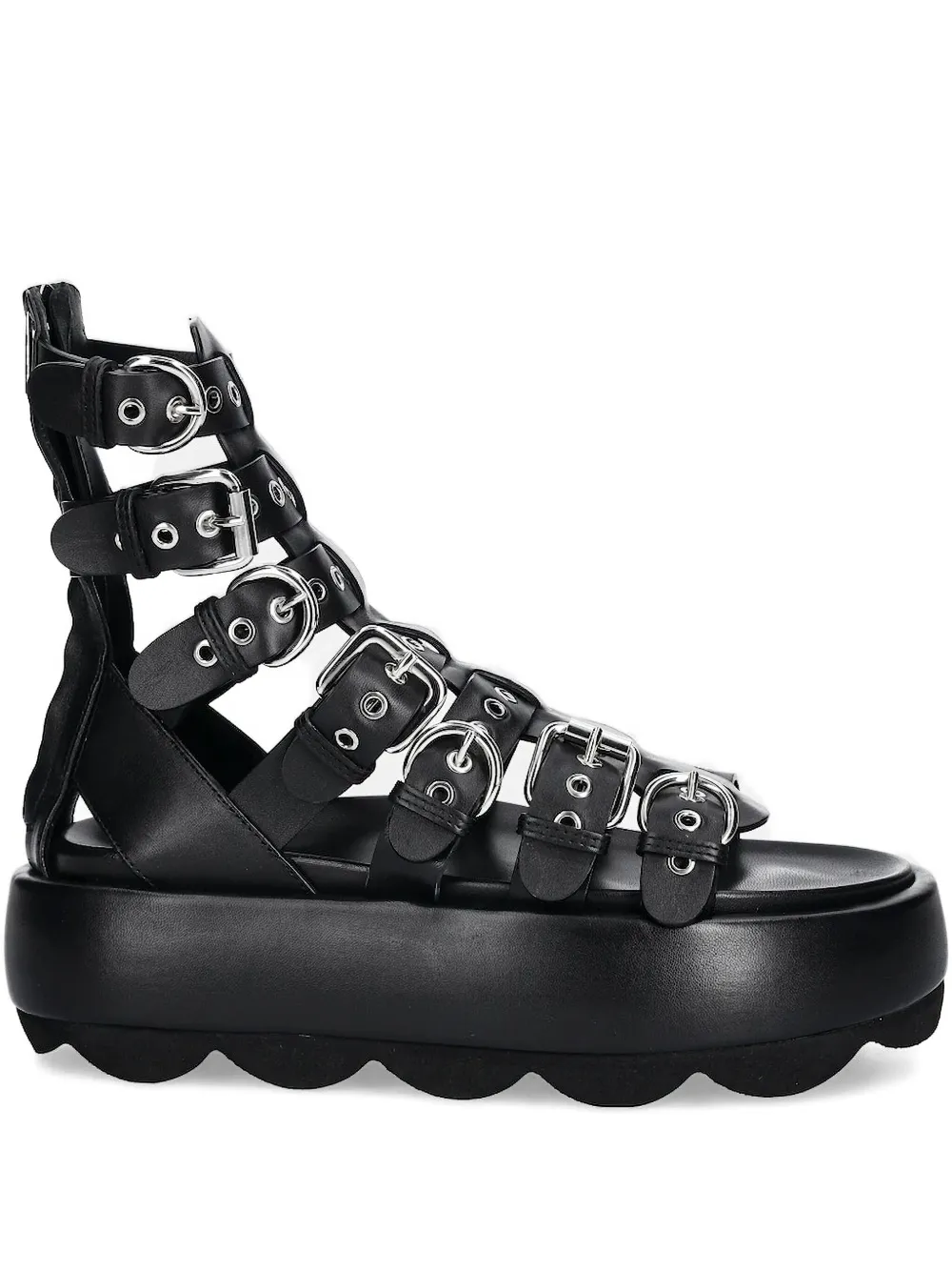 Черная платформа, множество ремешков с пряжками, люверсы, застежка-молния.