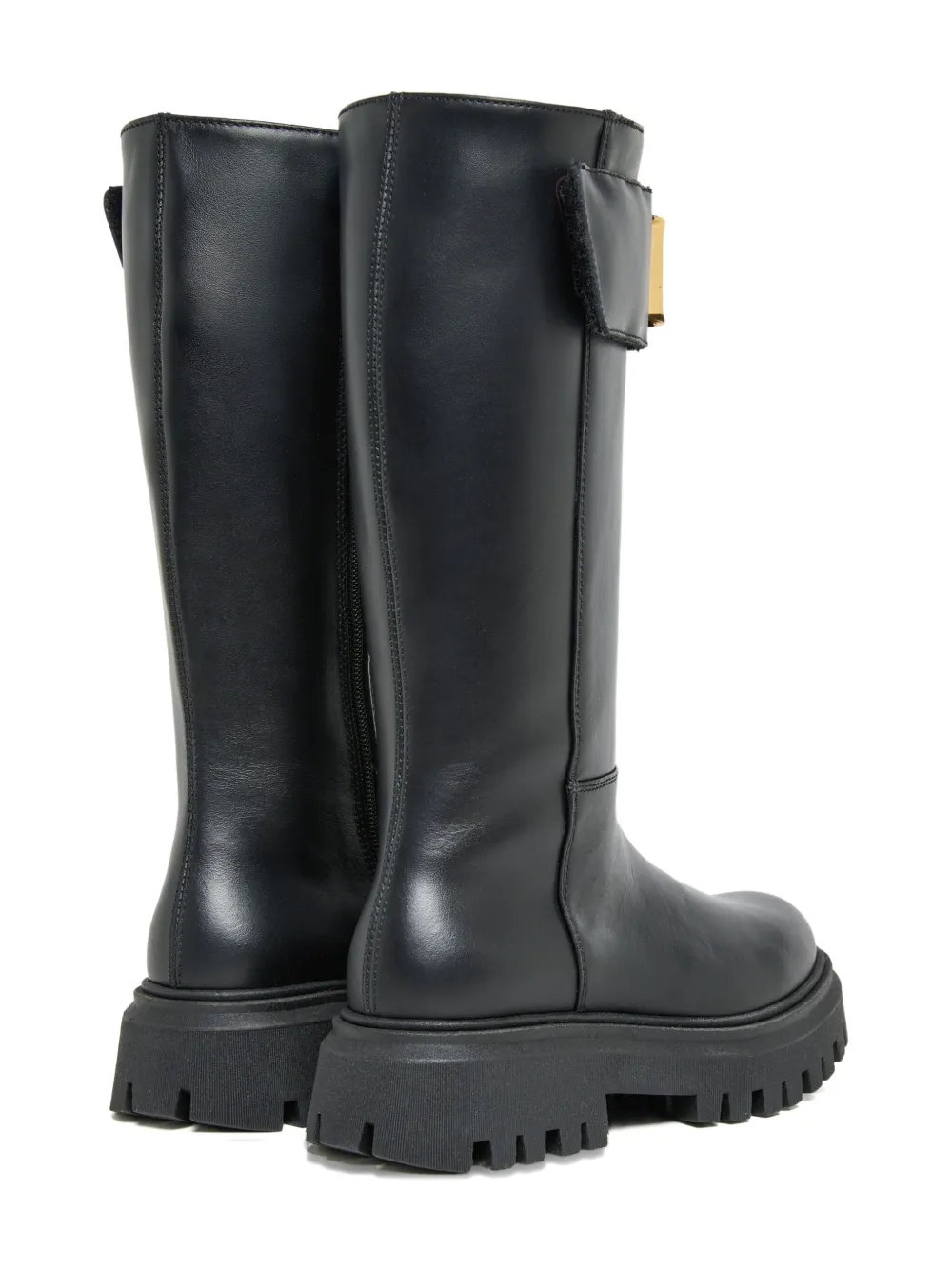 Черная телячья кожа, застежка на пряжку, золотистая фурнитура, толстая подошва, голенище до колена