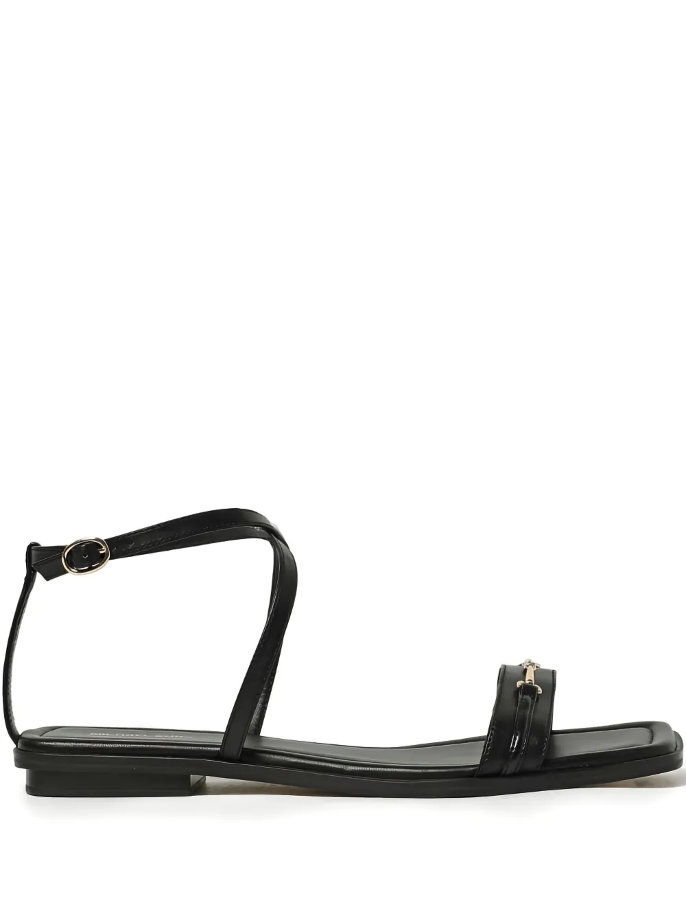 Верх из черной кожи, перекрещивающиеся ремешки, застежка на пряжку, золотистая фурнитура, квадратный носок