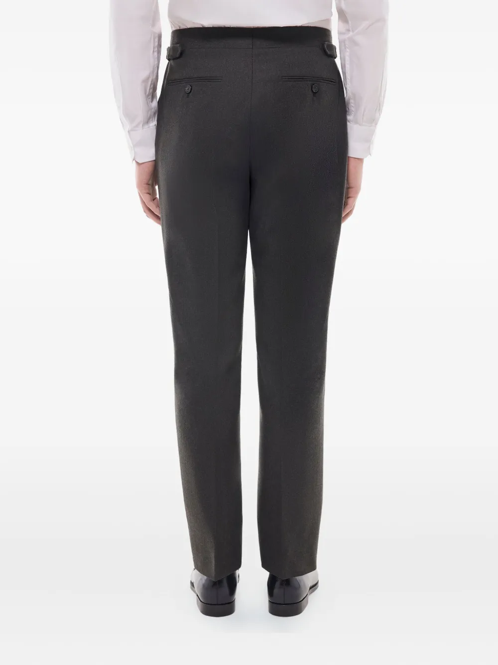 Темно-зеленая шерсть, застежка на пряжку, боковые карманы, заглаженные складки, застежка на пуговицы.