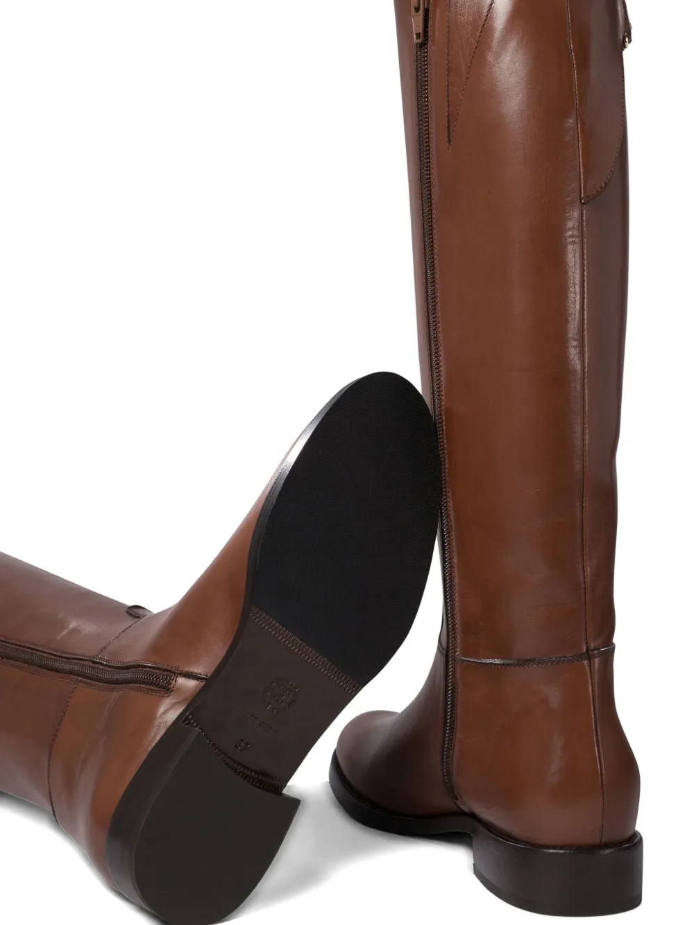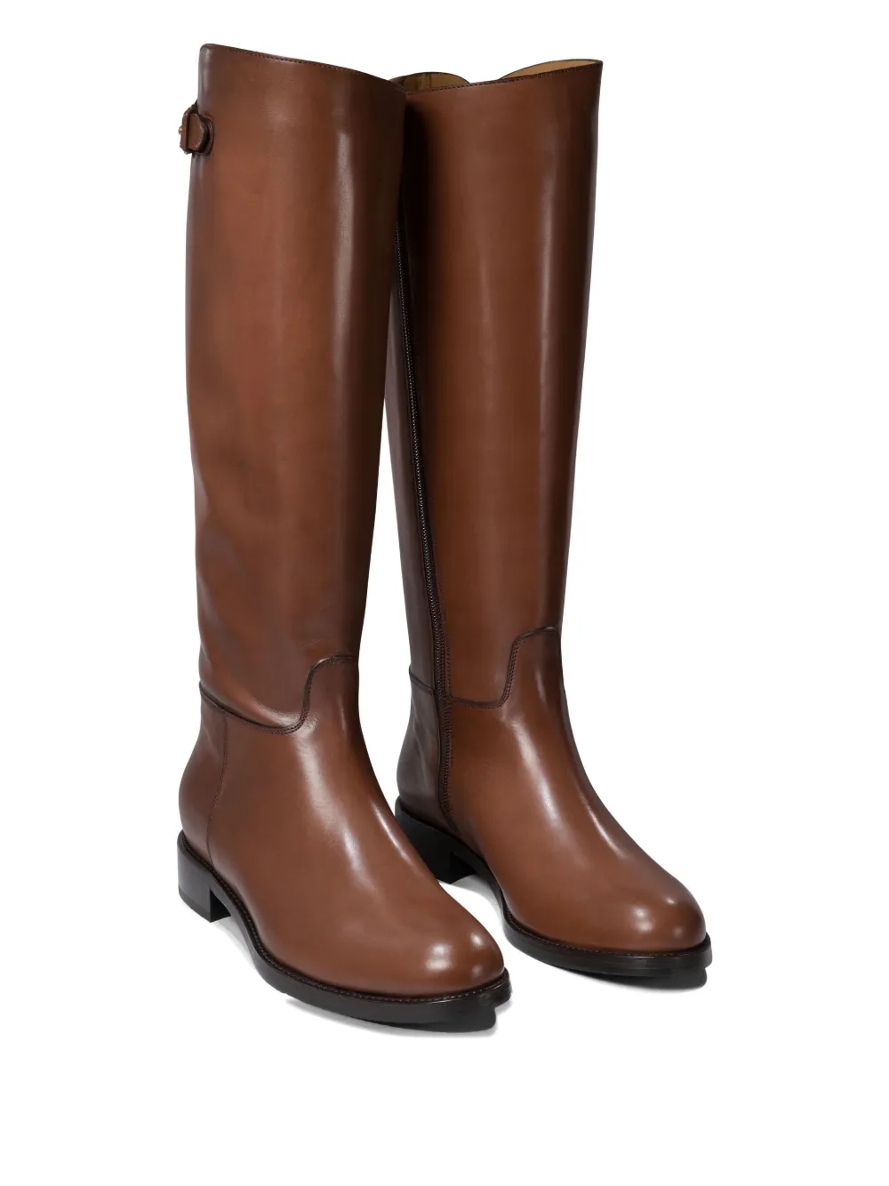 Коричневая кожа, застежка-молния, пряжка, миндалевидный носок, плоская подошва.