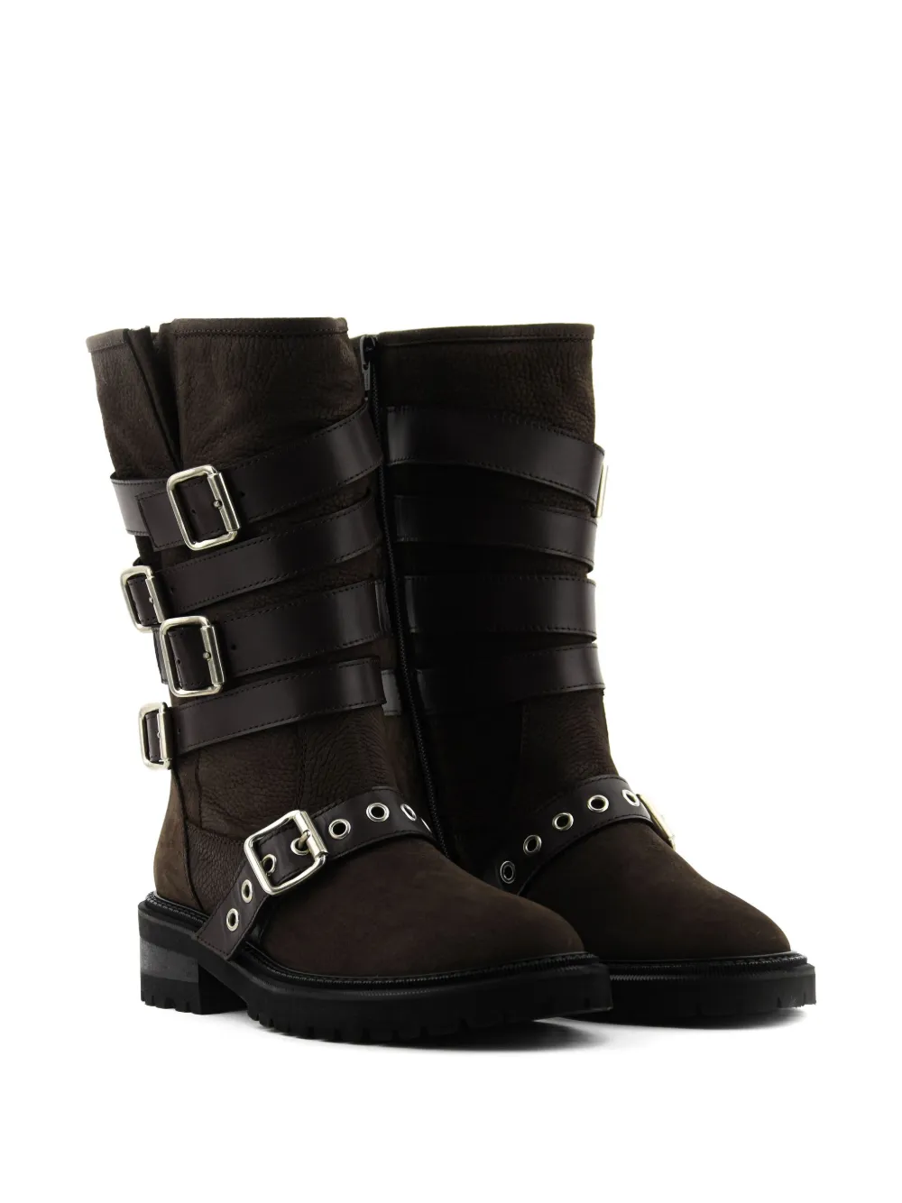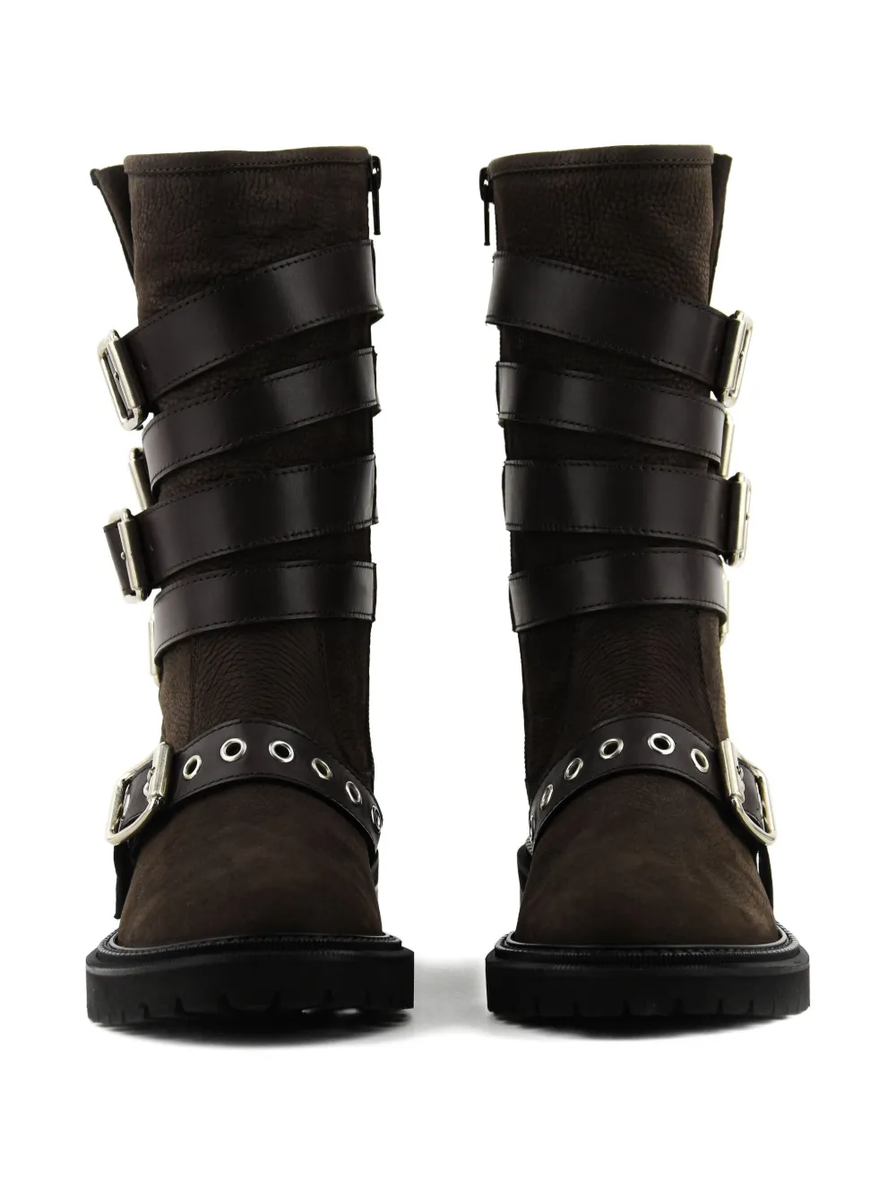Коричневый, с несколькими пряжками, кожаный верх, люверсы, плоская подошва, застежка-молния.