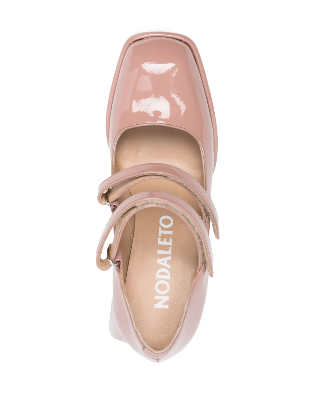Расцветка Blush Pink, телячья кожа, лакированная отделка, квадратный носок, застежка на липучке сбоку, стелька с логотипом и высокий блочный каблук.