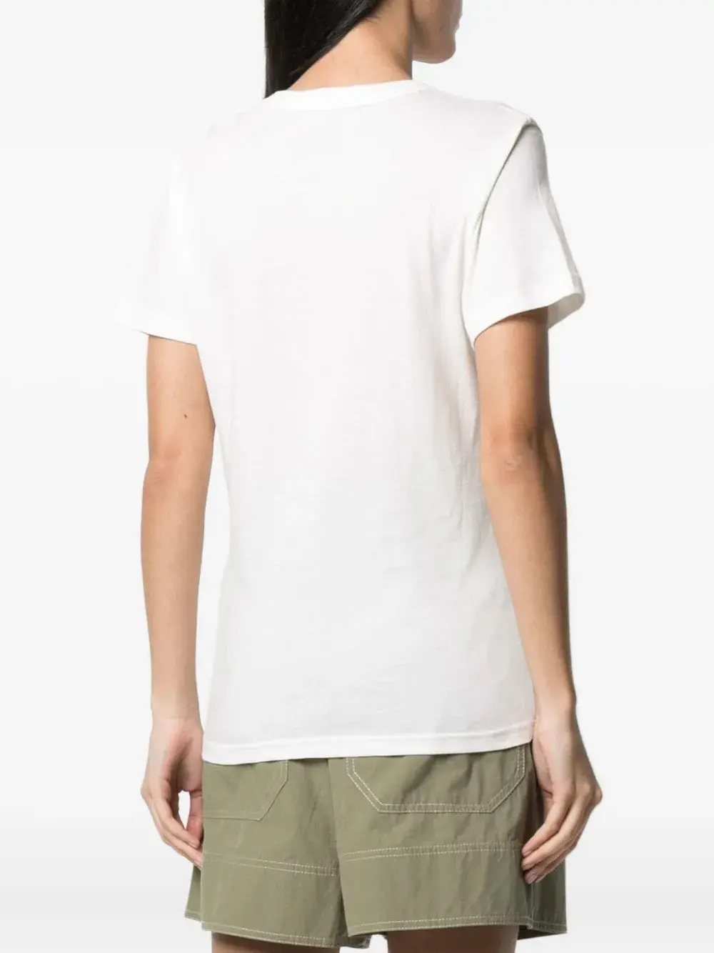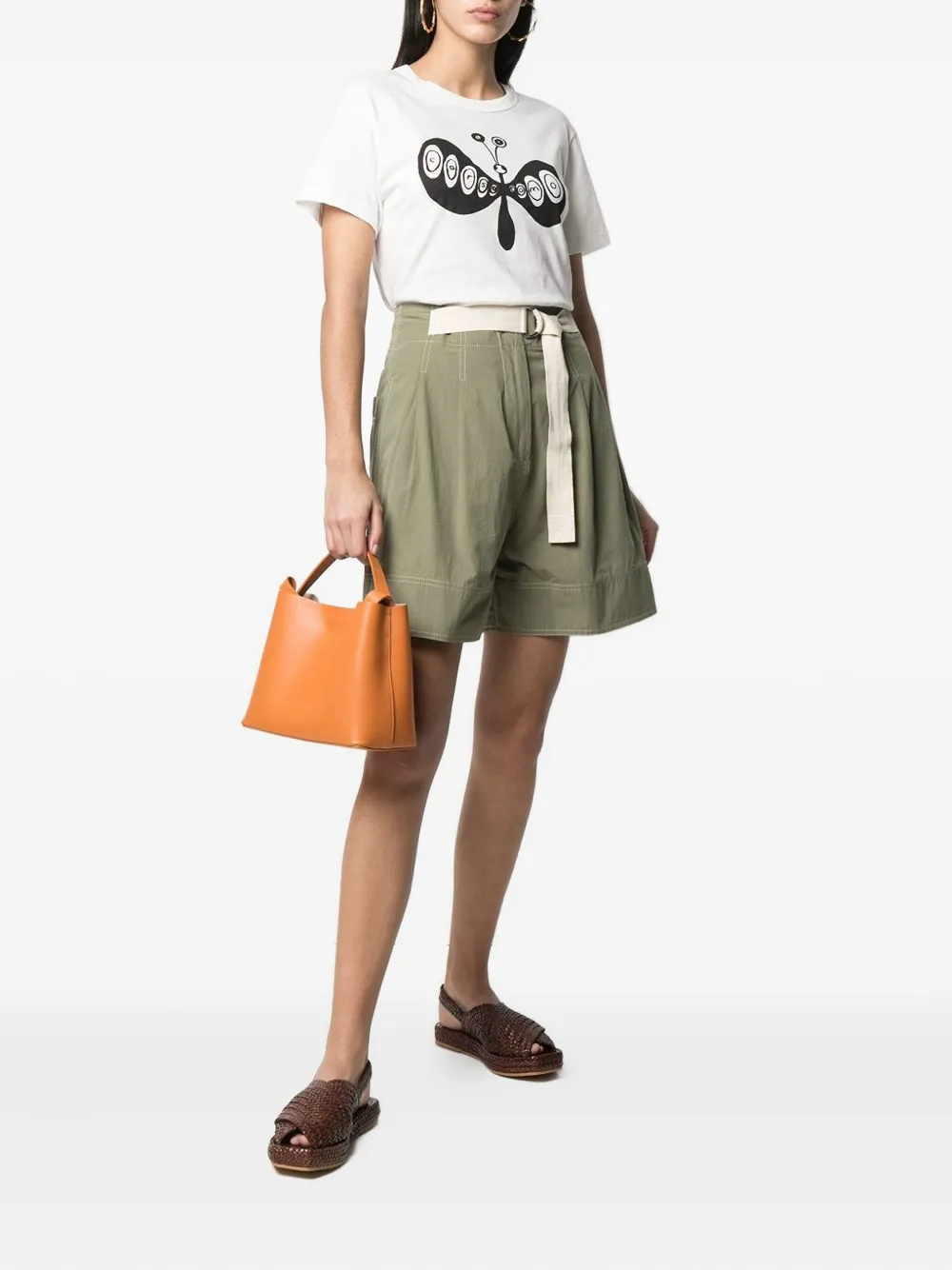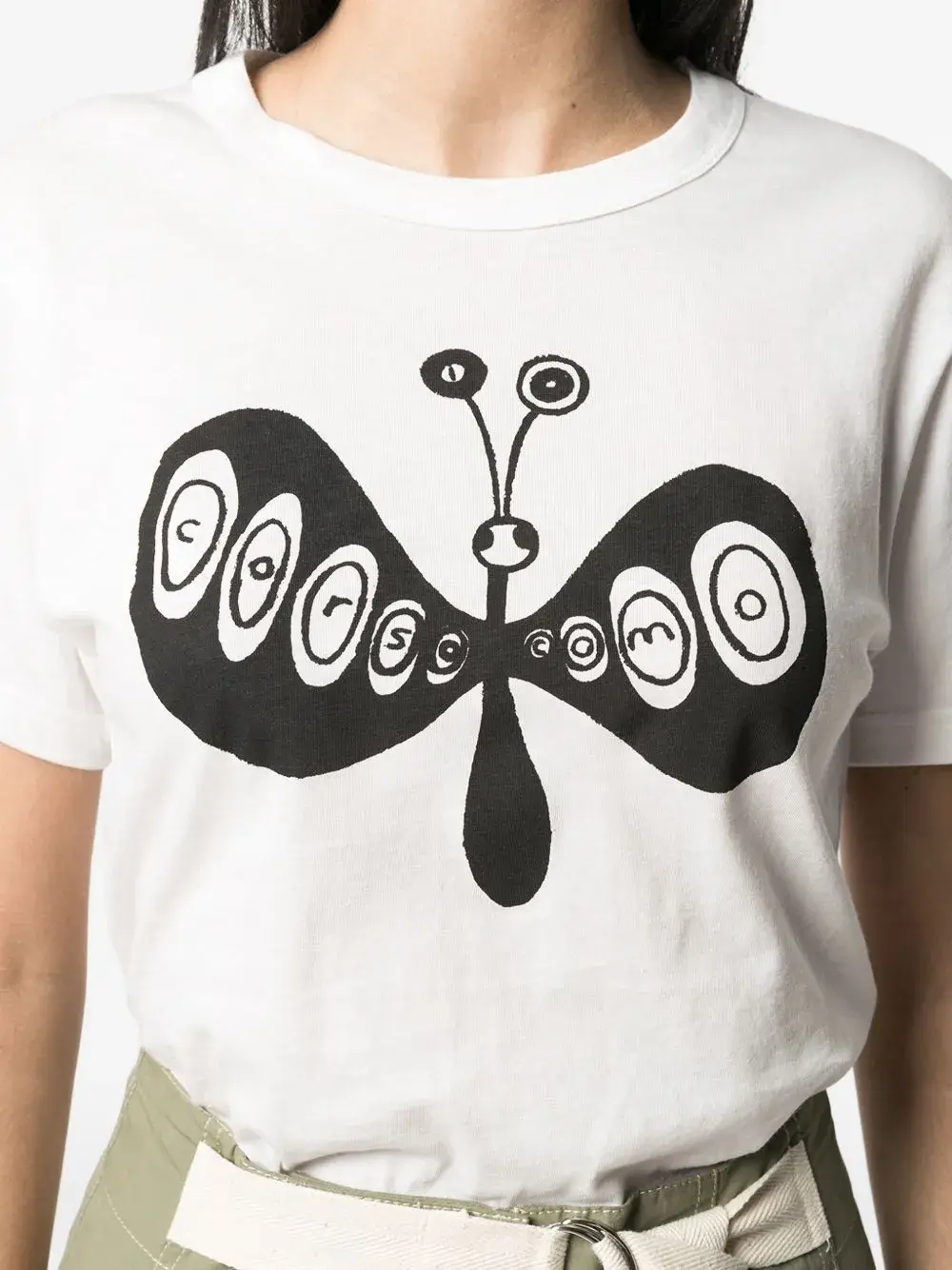 Белый круглый вырез, короткие рукава, прямой подол, принт с бабочкой и логотипом.