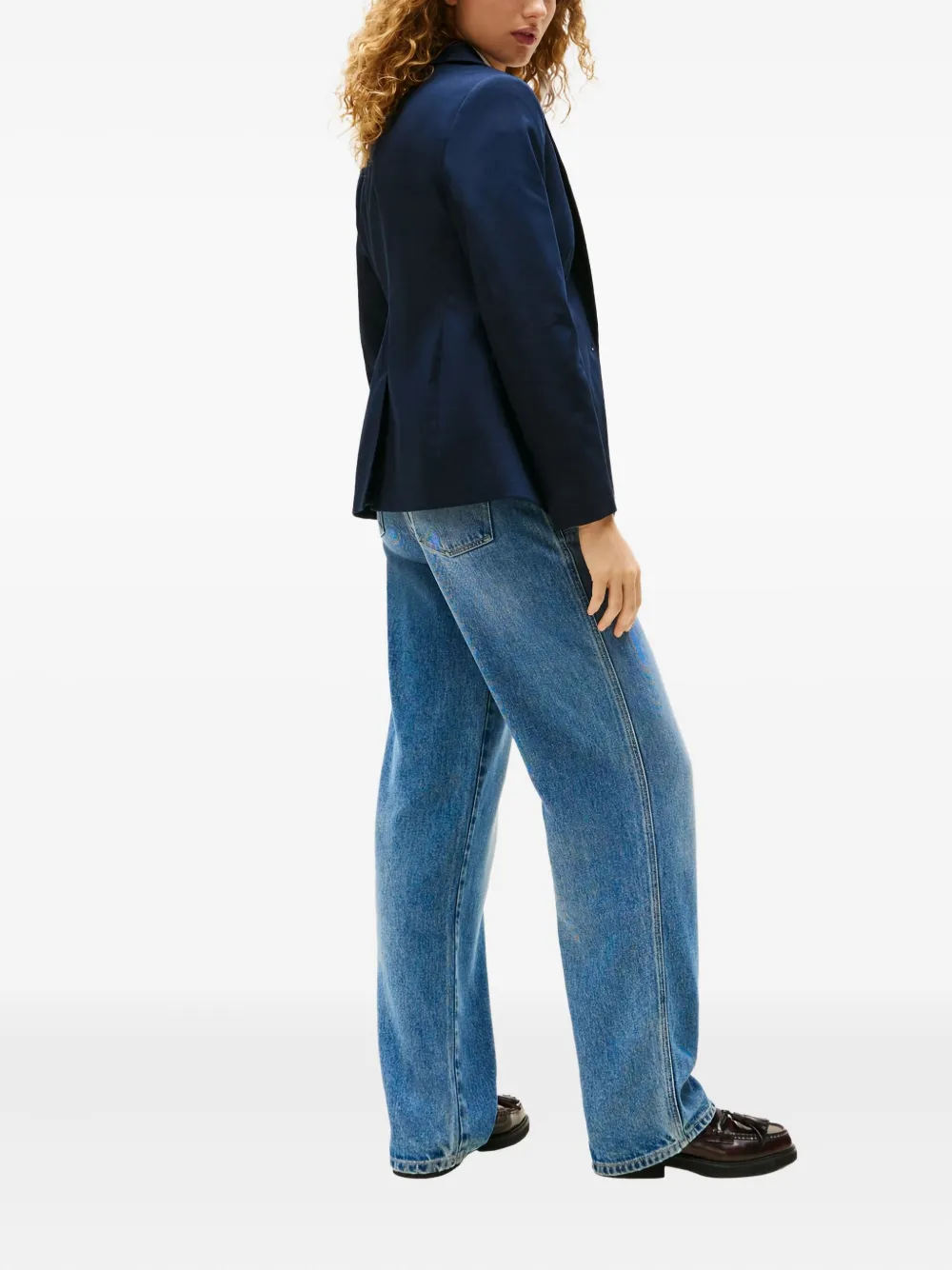 Синее однобортное изделие с заостренными лацканами, длинными рукавами, из хлопковой смеси.