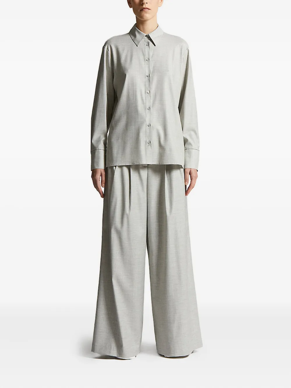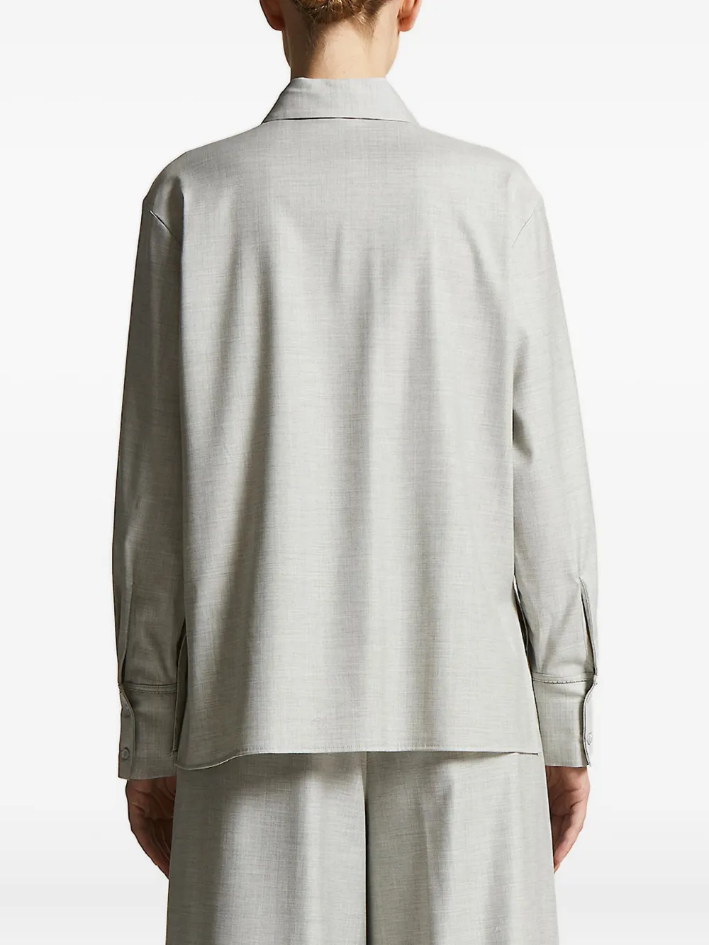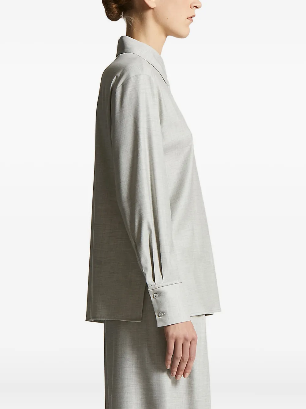 Серый заостренный воротник, длинные рукава, манжеты на пуговицах, пуговицы спереди, прямой подол