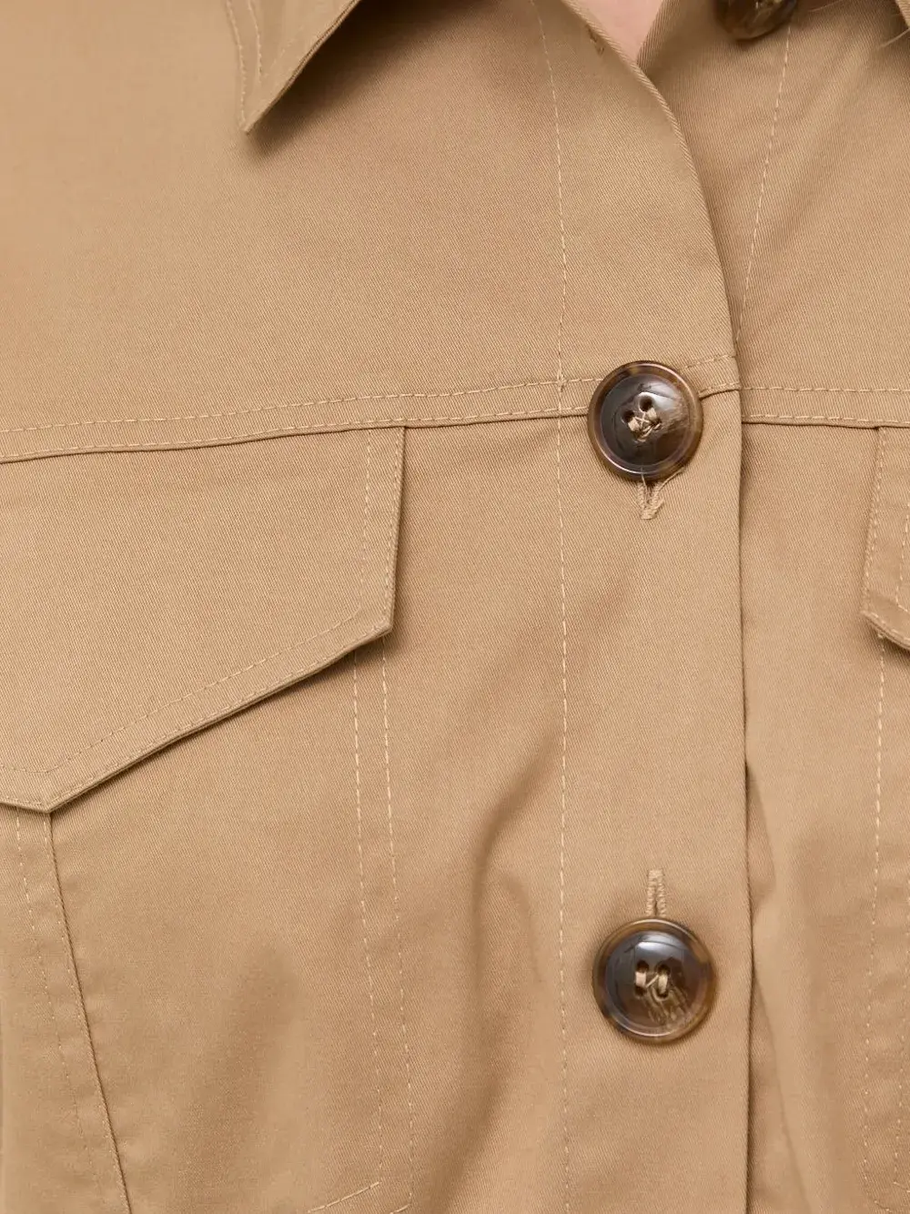 Светло-коричневый воротник рубашки, застежка на пуговицы, карманы с клапанами, затянутая талия, этикетка сзади.