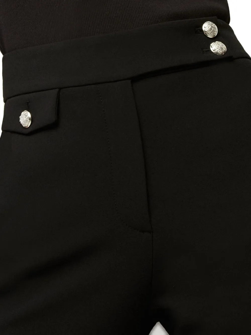 Черная модель с высокой талией, отделкой на пуговицах, передними карманами, прямыми штанинами, застежкой на молнию.