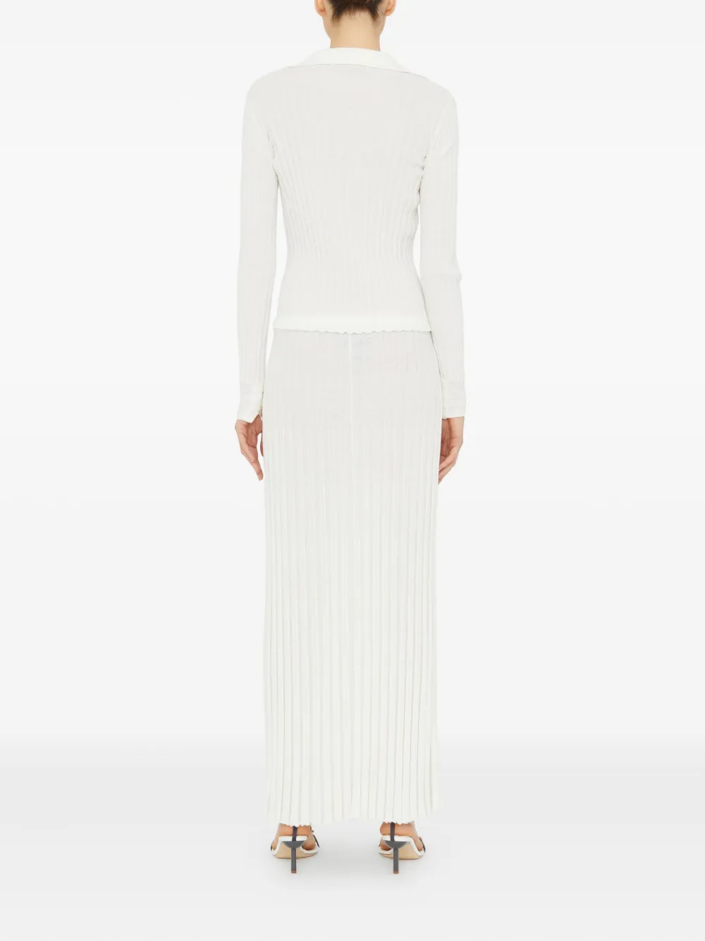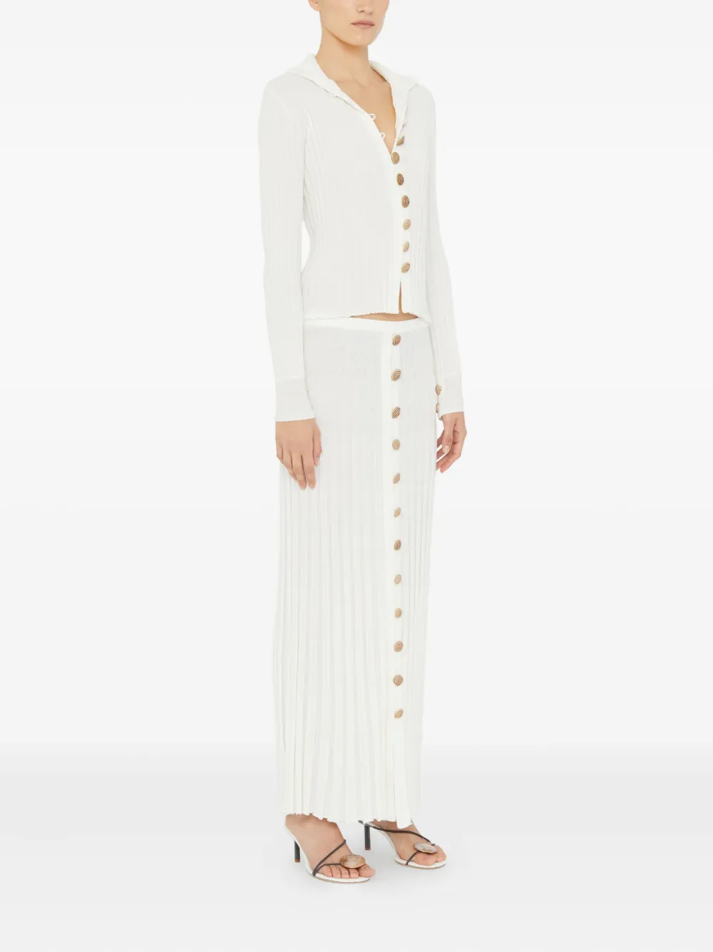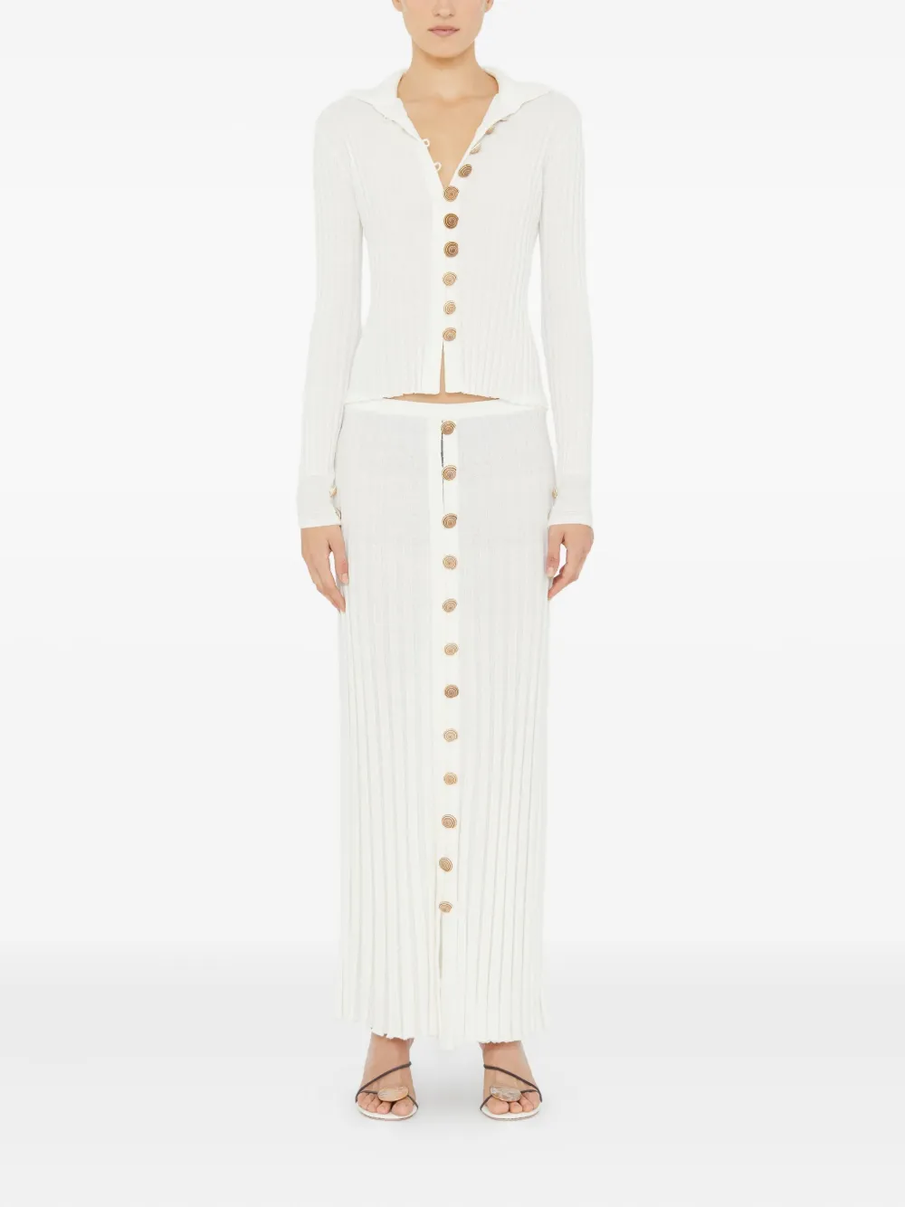 Белый трикотаж в рубчик, длинные рукава, застежка на пуговицы, детали на пуговицах, воротник-поло, спиральные пуговицы