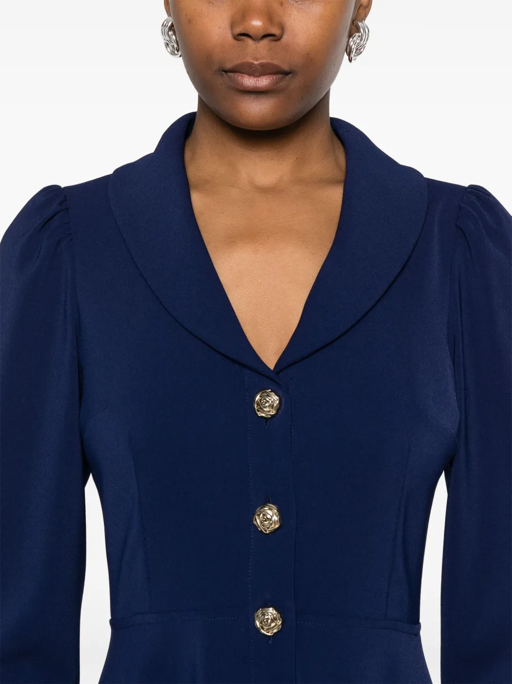 Застежка на пуговицы темно-синего цвета спереди, V-образный вырез, манжеты на пуговицах, рукава три четверти