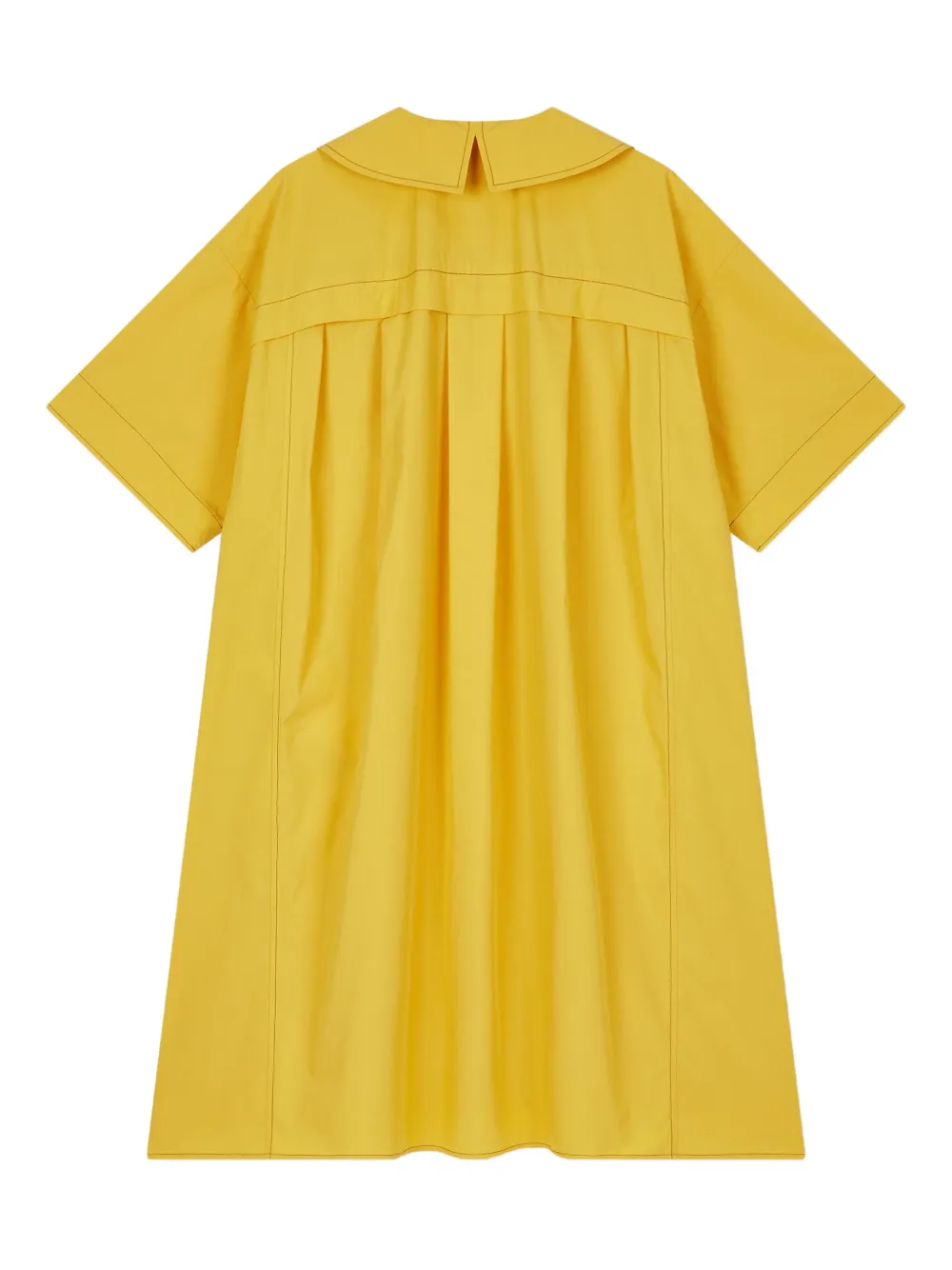 Классический воротник горчично-желтого цвета, короткие рукава, застежка на пуговицы спереди, два накладных кармана, складки сзади.