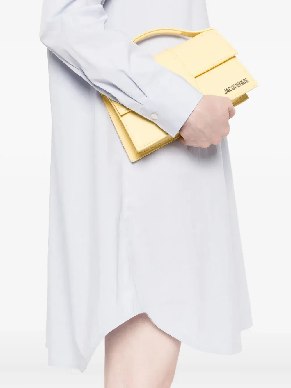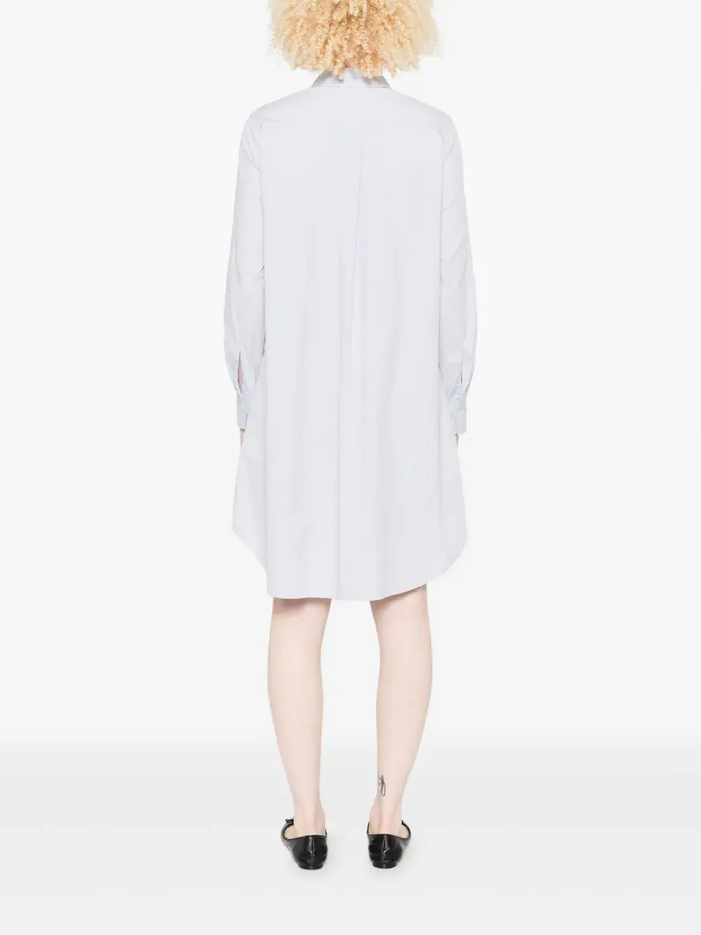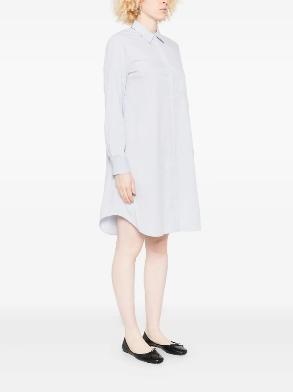 Светло-голубая застежка на пуговицы, классический воротник, длинные рукава, нагрудный карман.