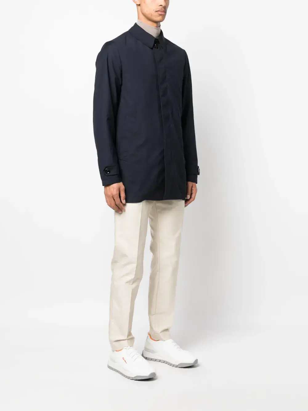 Синий, потайная пуговичная застежка спереди, классический воротник, длинные рукава, манжеты на пуговицах и два кармана по бокам.